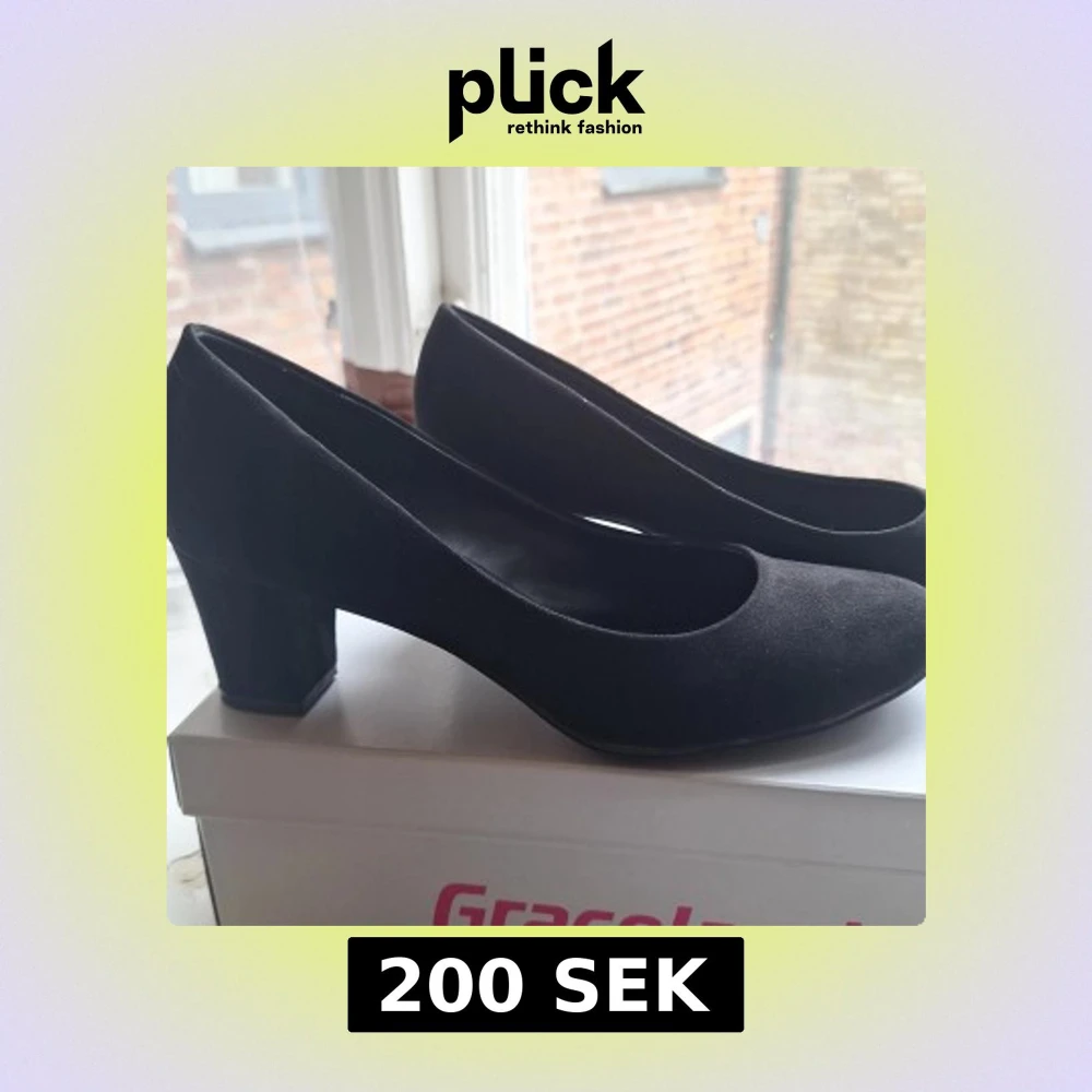 Säljer ett par klassiska svarta pumps från Graceland med rund tå och klack. Skorna är i syntetmaterial och har en stilren design som passar till många olika outfits. Perfekta för dig som gillar enkel och tidlös stil. Använda enbart två gånger, ena klacken har en liten reva på insidan, men inget som syns när dem är på!