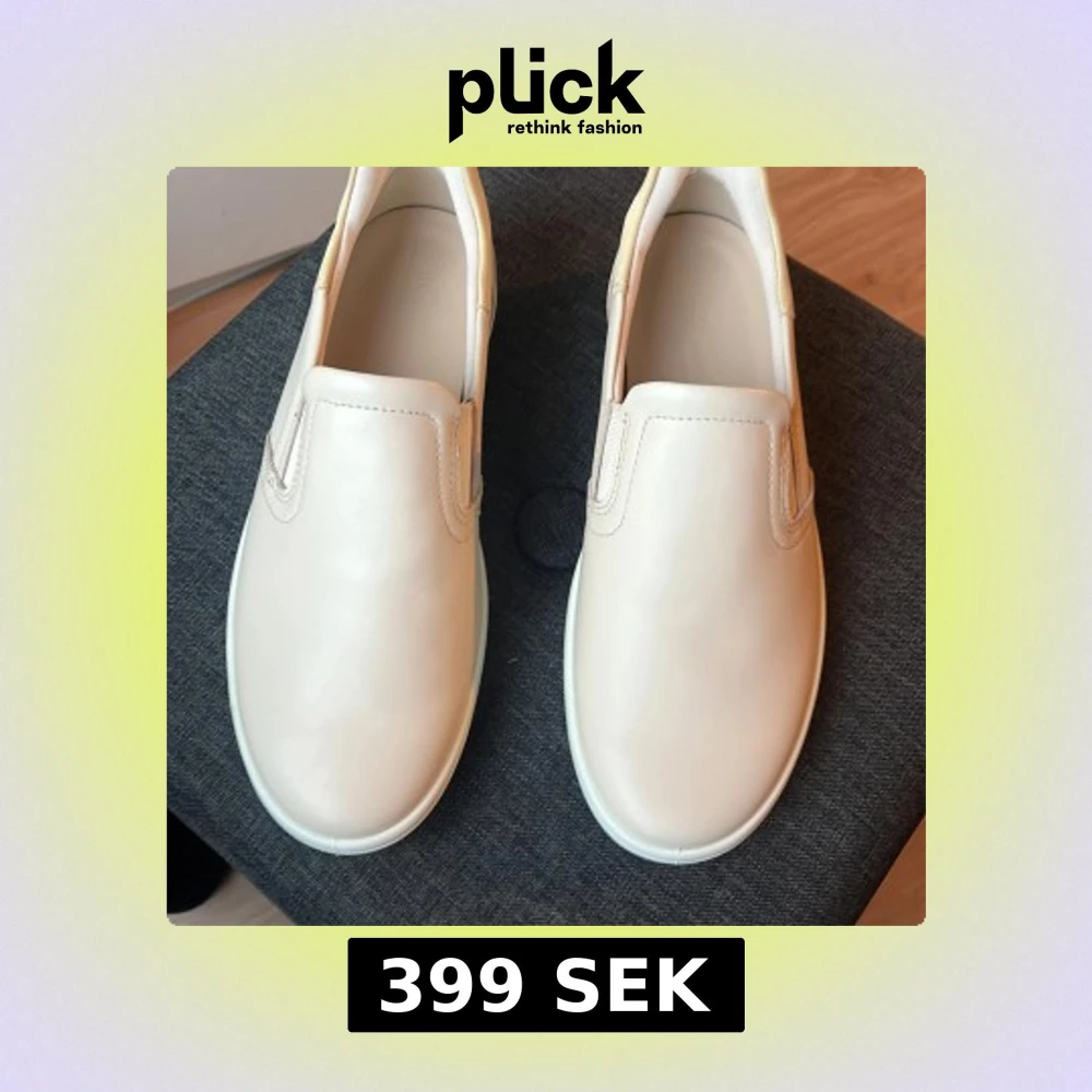 Stilrena vita slip-on sneakers från ECCO i slät skinn med elastiska paneler på sidorna för enkel påtagning. Skorna har rund tå, platt sula och diskret ECCO-logga under sulan. Perfekta för en clean och minimalistisk look. Skick 9/10 använd ca 3gånger