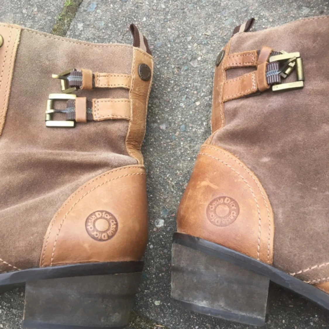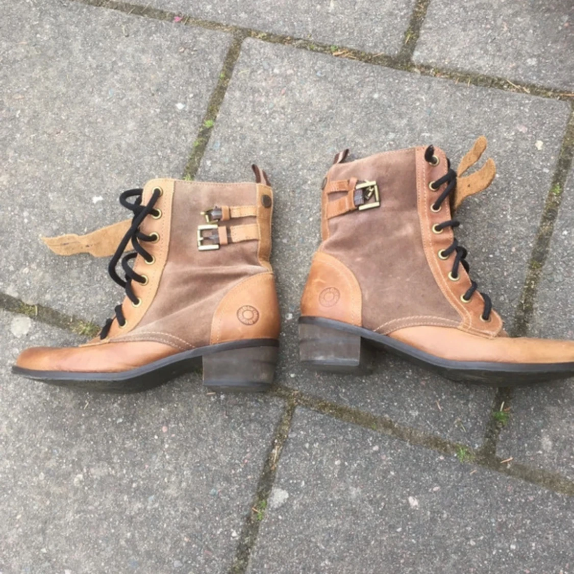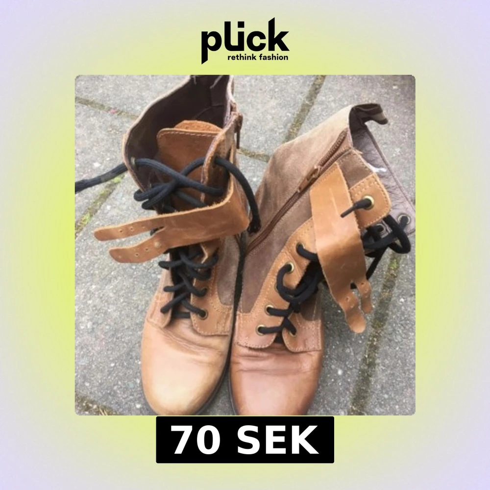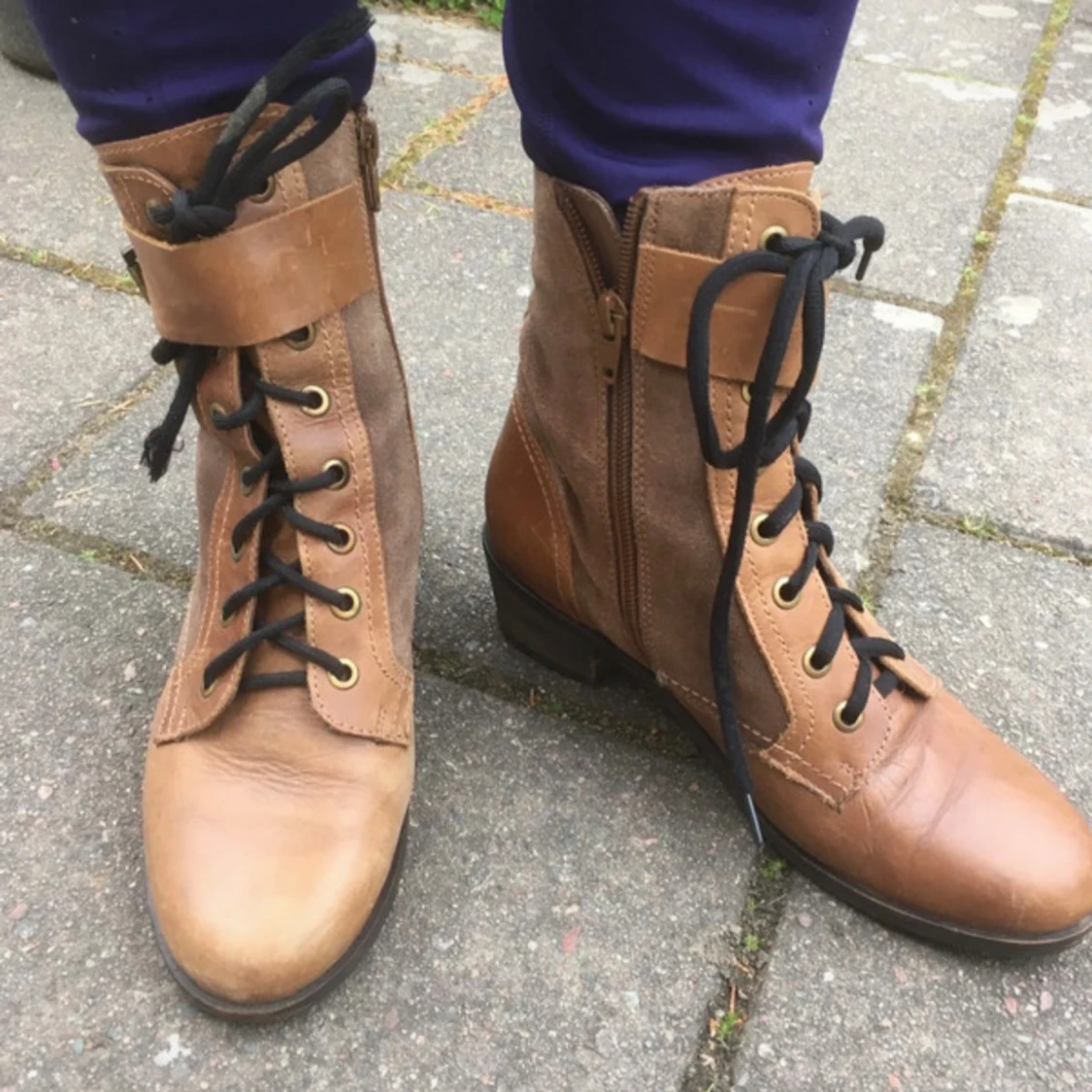 Snygga bruna boots från Dasia med mocca (tror jag att det är men inte 100). De har snörning framtill. Snörena skiljer något i texturen. Dragkedja på sidan och två coola spännen vid skaftet. Rund tå och en liten klack.. Perfekt för dig som gillar detaljer och vill sticka ut. Ingen varm vintersko. En liten nyansskillnad på skorna. Lite slitet skosnöre som fransat sig.