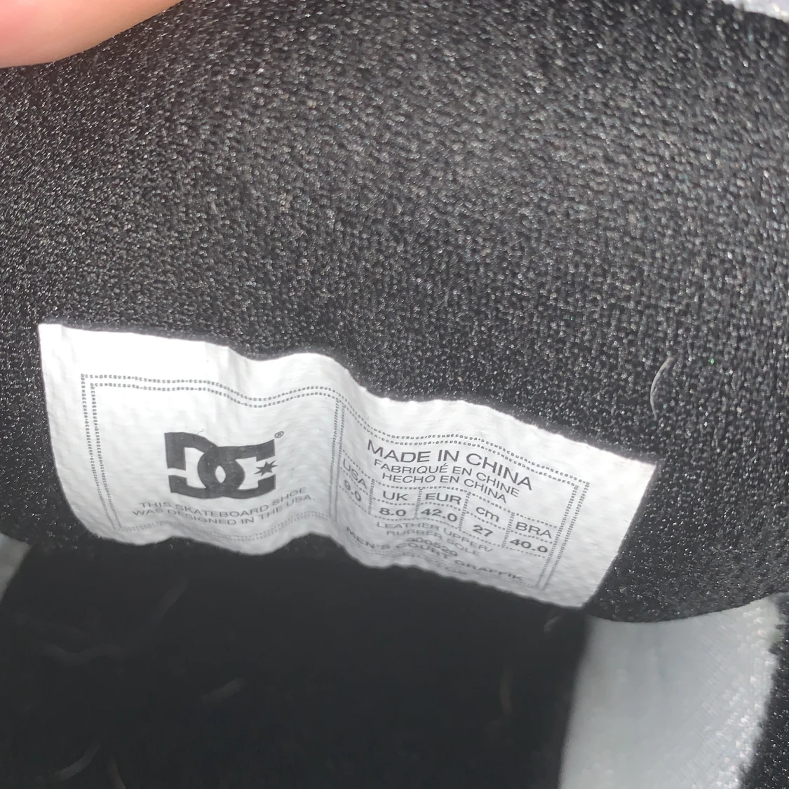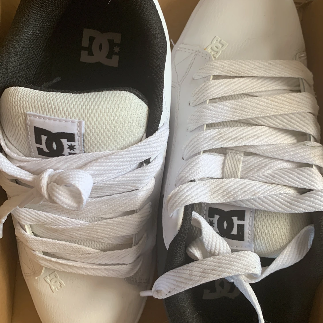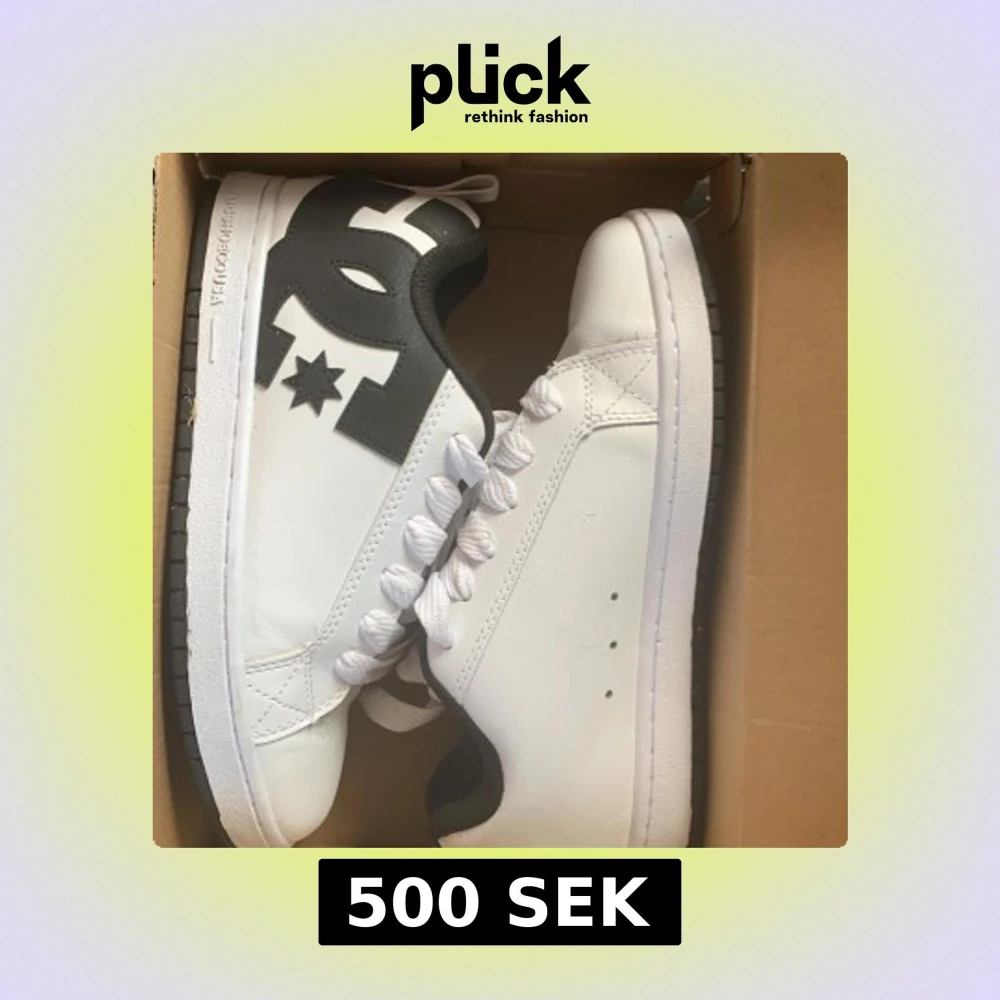 Säljer ett par klassiska DC Shoes sneakers i vitt och svart med stor DC-logga på sidan. Skorna har breda vita snören, platt sula och rund tå. Ovandelen är i syntetmaterial. Fick dom som julklapp från min mamma men dom var i fel storlek.