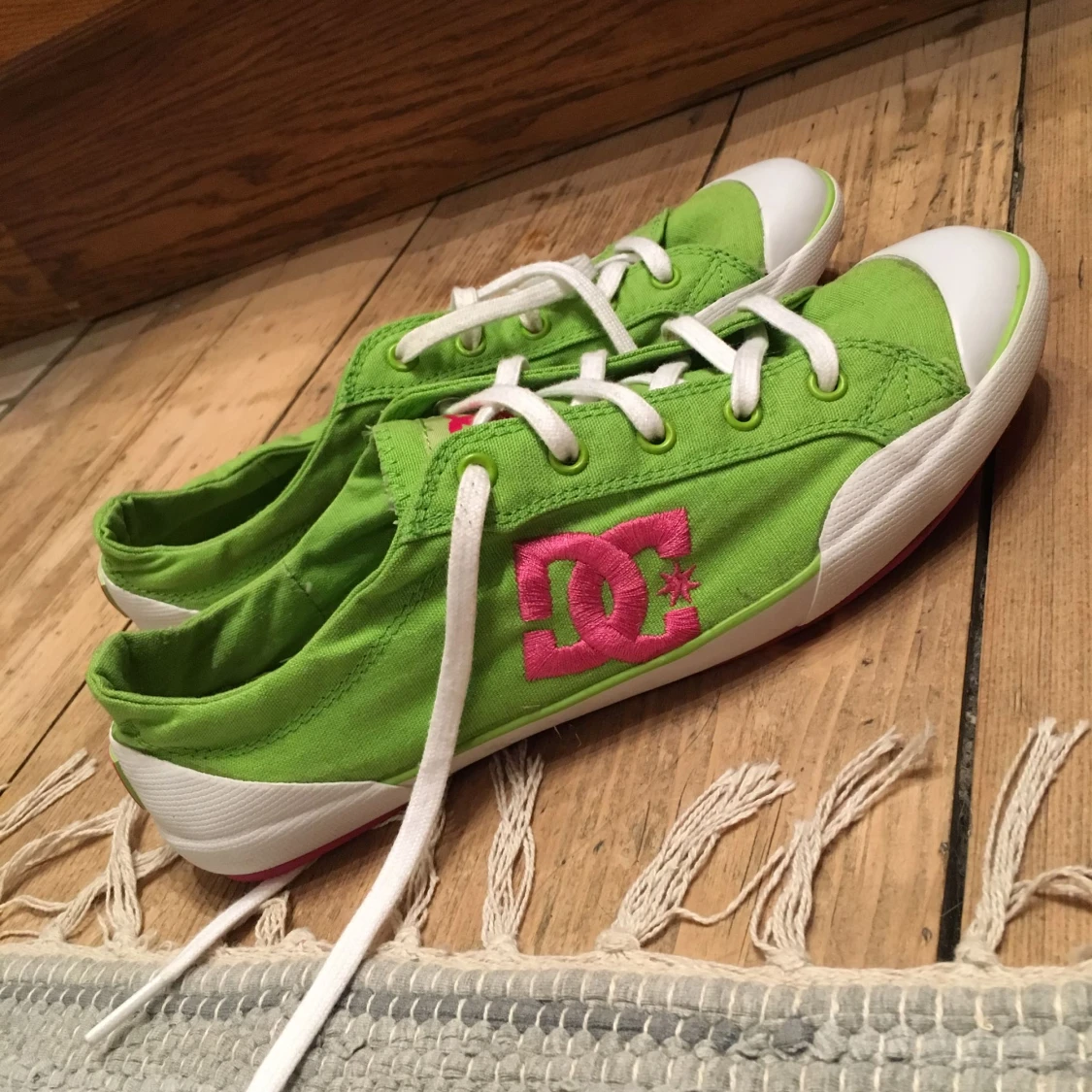 DC skor i grönt och rosa använda fåtal gånger, finns en fläck som 3:e bilden visar men annars helt ok skick. Dom är bra som tränings skor och lätta att gå i, swish går bra köpare står för frakt