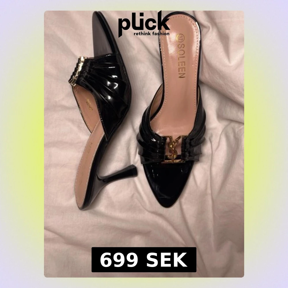 Snygga svarta klackar från Soleen i glansigt lackmaterial med spetsig tå och öppen häl. Skorna har en elegant guldfärgad detalj framtill och smal hög klack. Jättebekväma. Har i storlek 36 samt 37, och även beiga. Endast provade, storlek 37 har dock en liten repa som syns på bild men inget som märks av. Blev lite för små för mig ☹️
