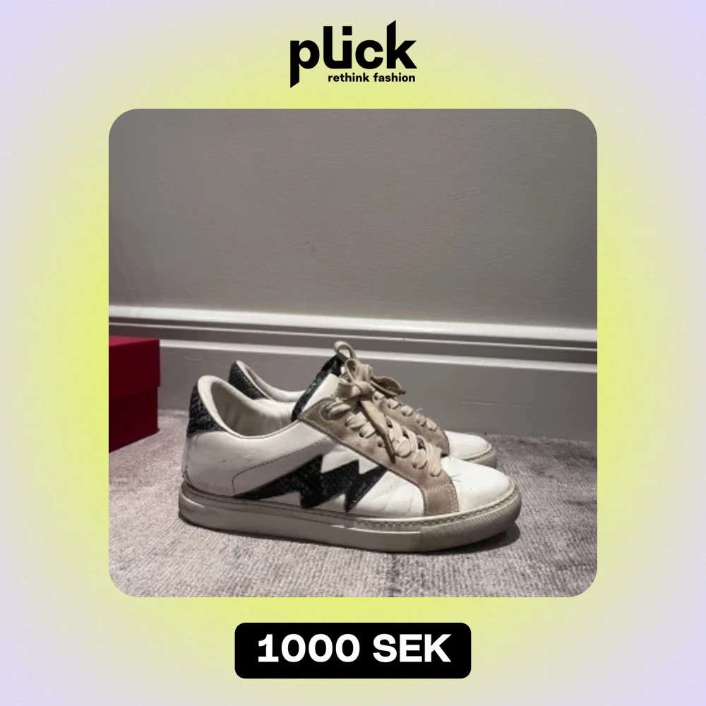 Säljer mina Zadig & Voltaire sneakers med supersnygga blåa detaljer. Skicket på skorna är bra utöver en skråma på hälen (infogad sista bild) men annars är de varsamt använda. Storlek 38 och passar de som har just strl 38, alltså normal i size!