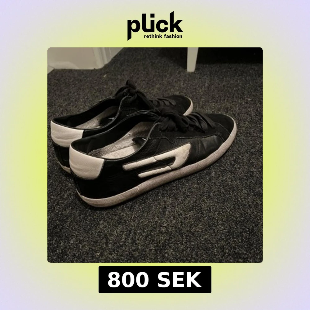 Snygga svarta sneakers från Diesel med vita detaljer och röd sula. Skorna har snörning och en stilren design som passar perfekt för en casual look.