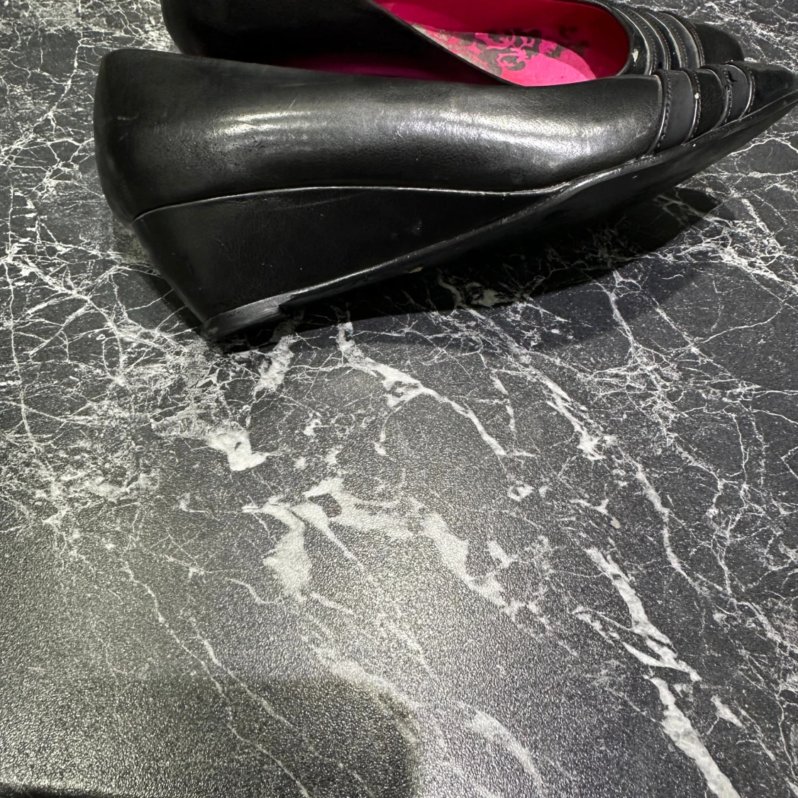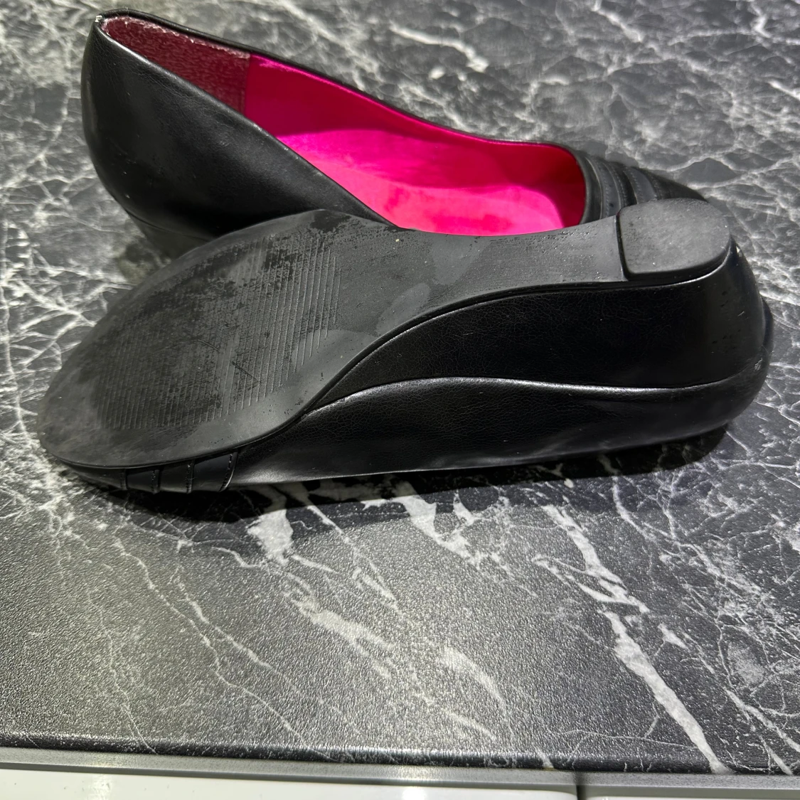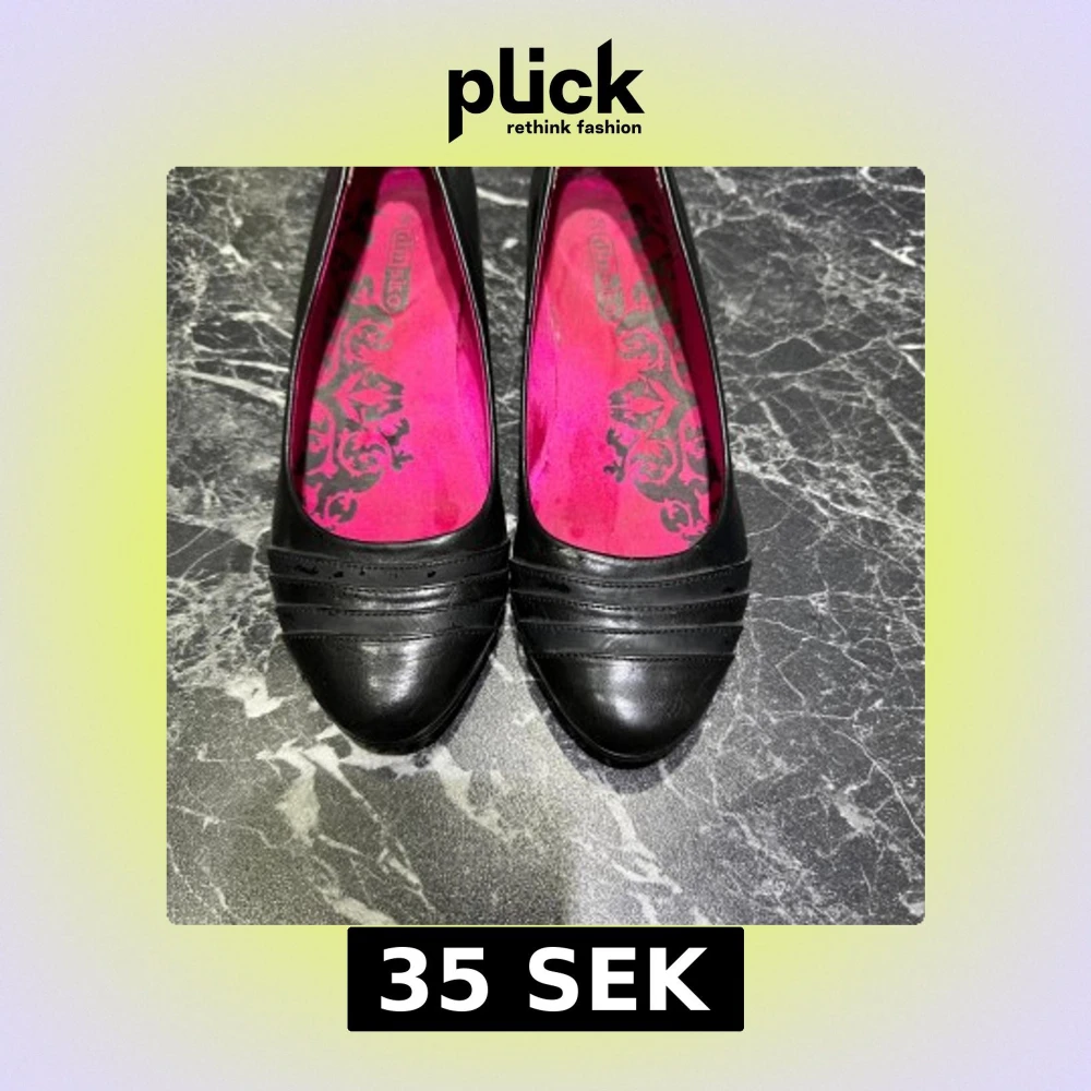 Svarta pumps från Din Sko med kilklack och rund tå. Skorna har dekorativa sömmar framtill och en snygg rosa innersula med svart mönster.