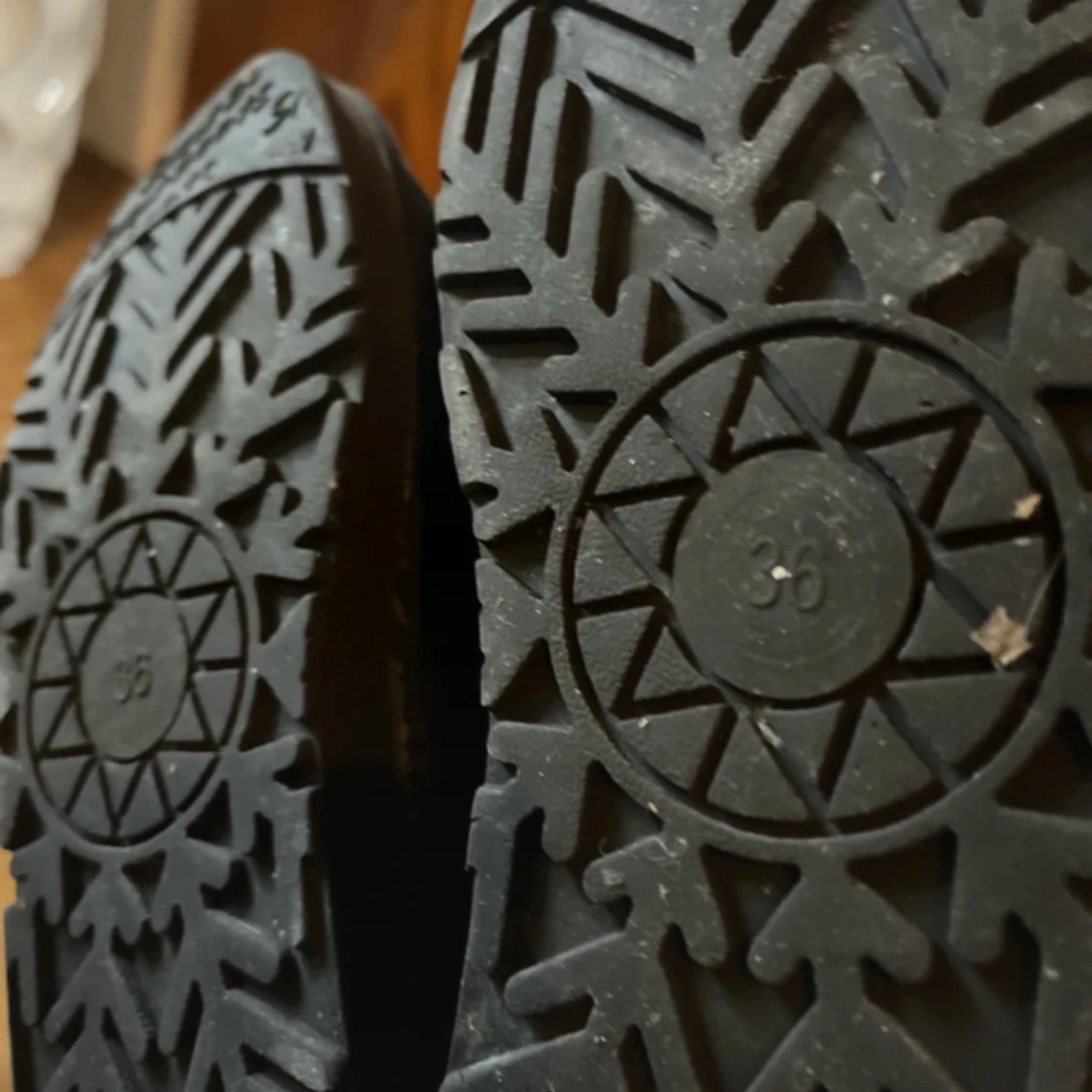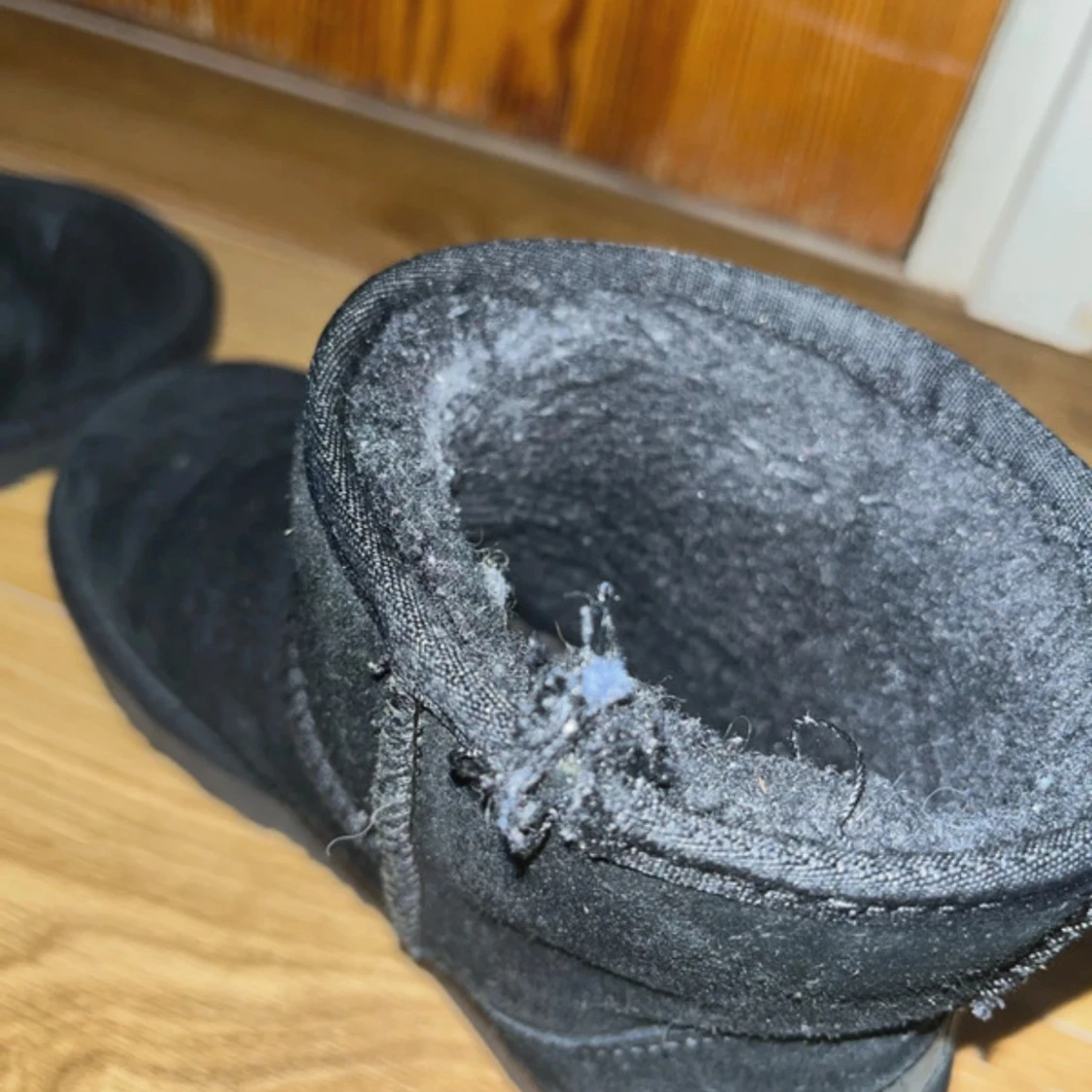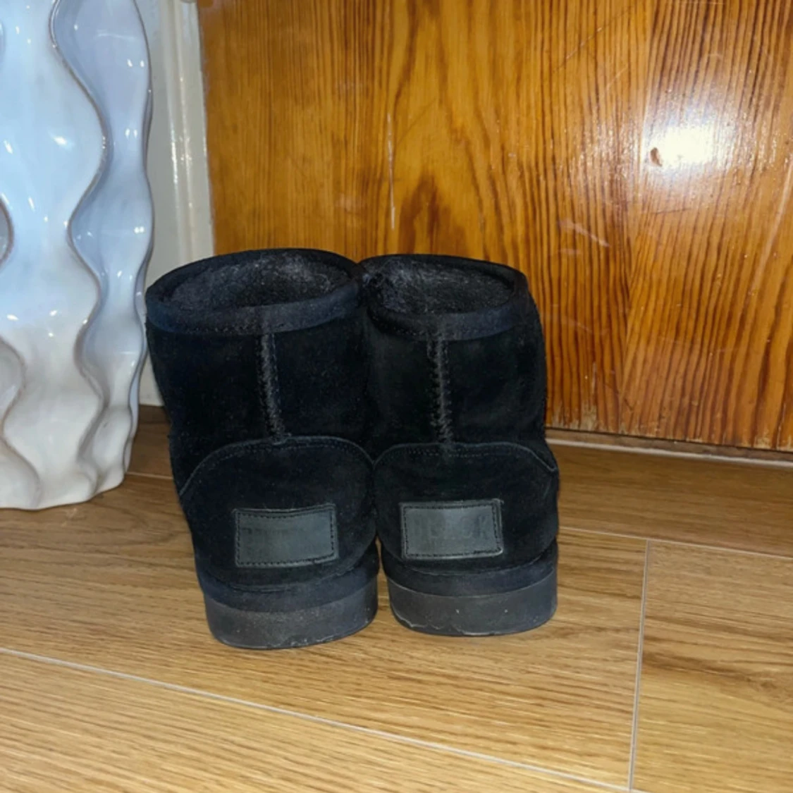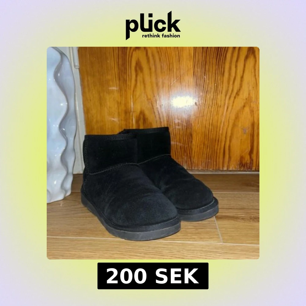 Svarta boots med låg skaft och rund tå, tillverkade i mjuk mocka med fluffigt foder på insidan. Sulan är platt och har ett mönster för extra grepp. Perfekt för kalla dagar och enkel att matcha med olika outfits.