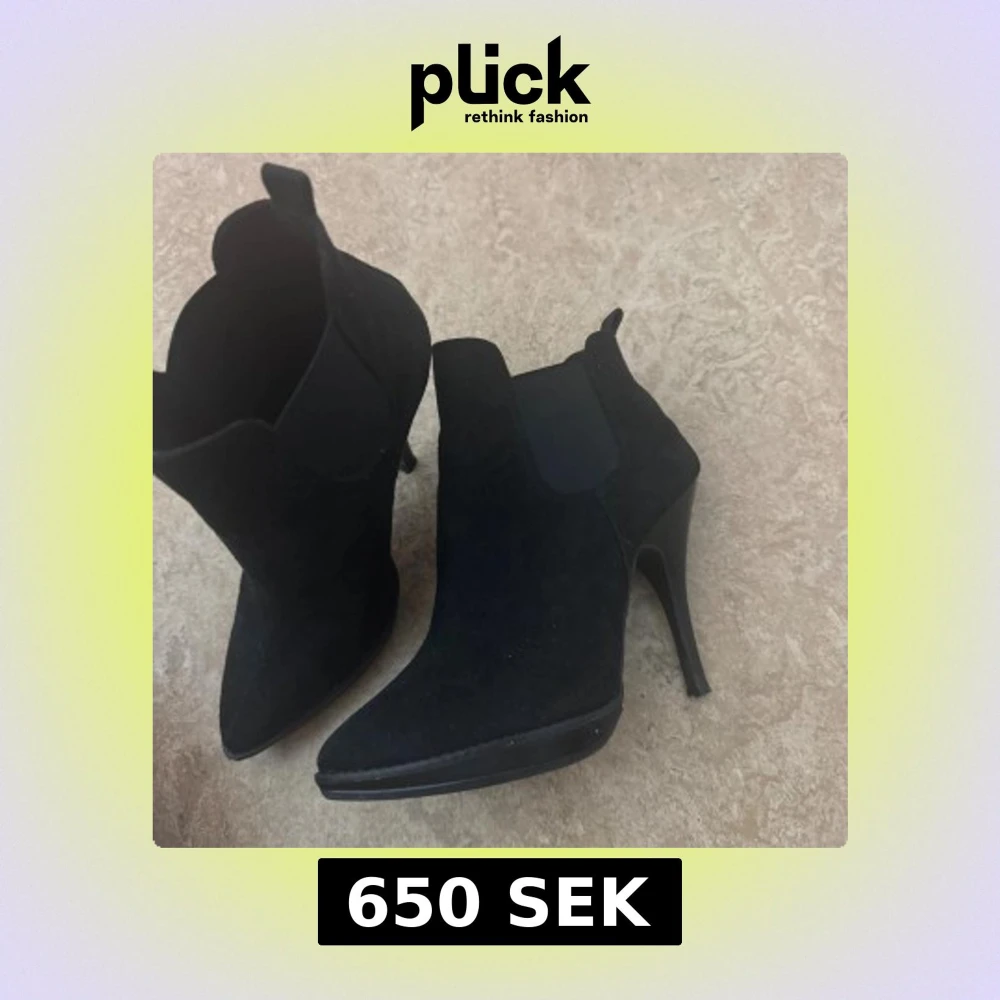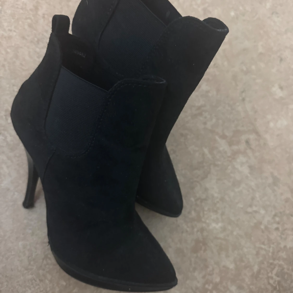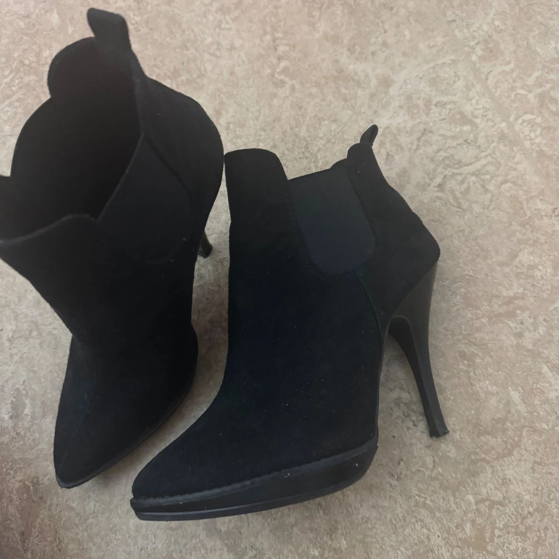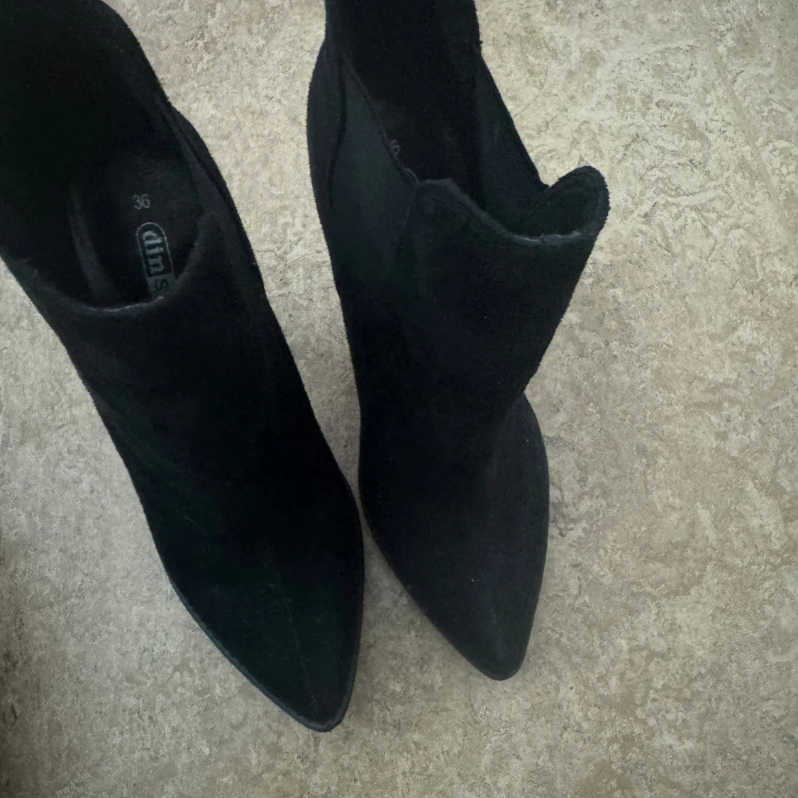 Super snygga svarta stövletter från Dinsko i mockaimitation med spetsig tå och hög klack. Storlek 36, knappt använda.