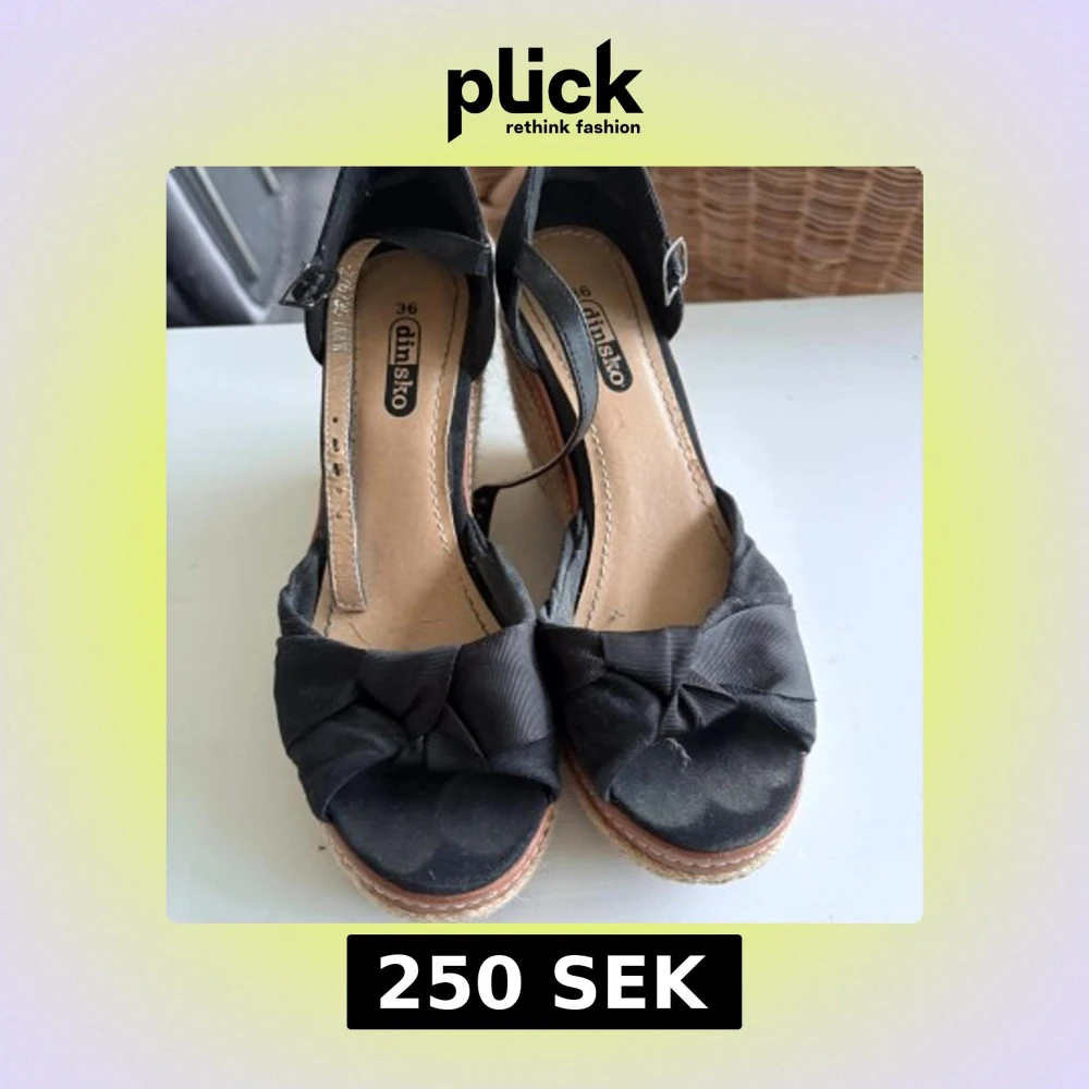 Snygga svarta sandaler med kilklack från Din Sko. Skorna har öppen tå, rosett framtill och justerbart spänne vid ankeln. Ovandelen är i tyg och kilklacken är klädd i flätad jute för en cool sommarkänsla. Perfekt för dig som gillar att sticka ut med stil.