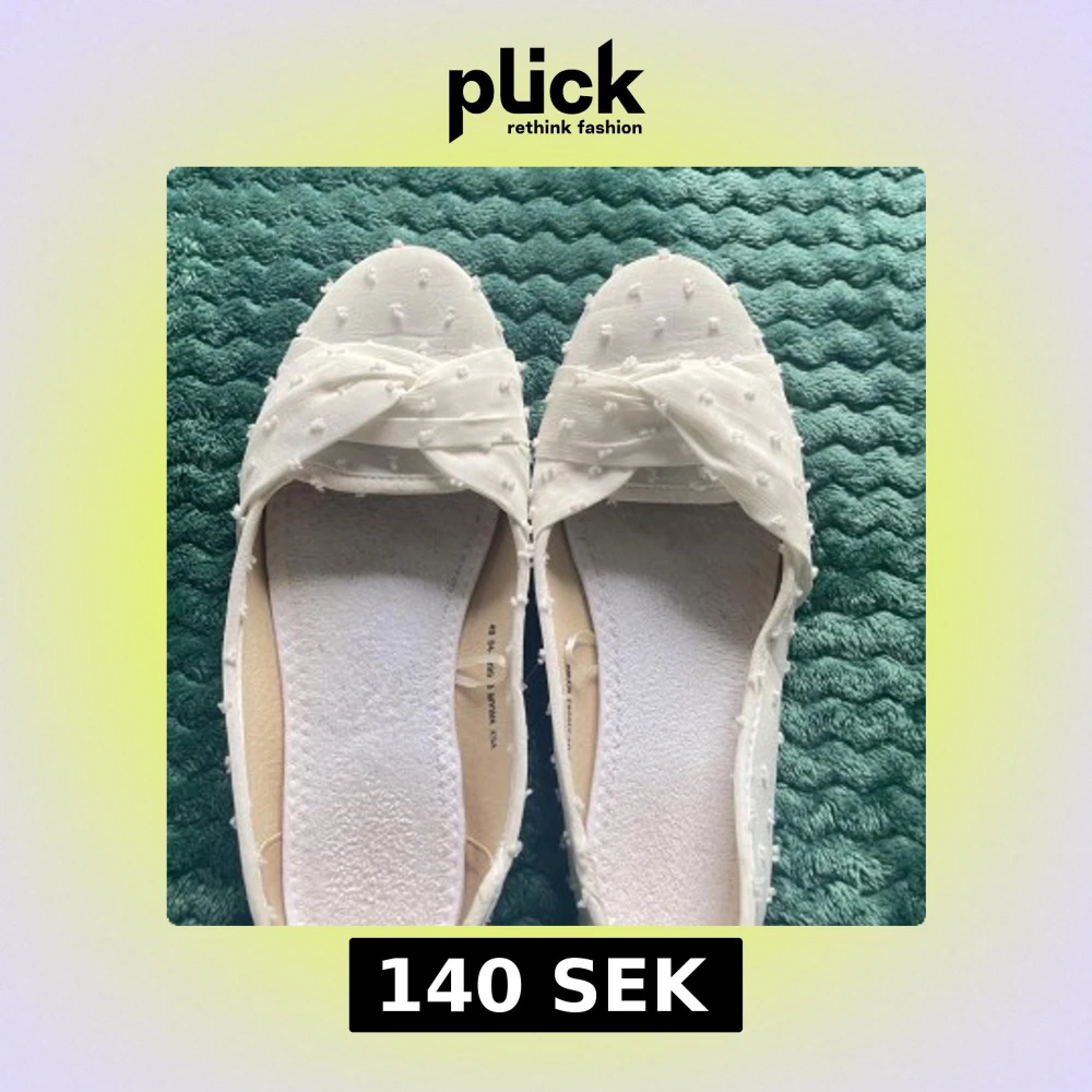 Säljer ett par vita ballerinaskor med spetsig tå och dekorativ rosett framtill. Skorna har ett prickigt mönster med små tygprickar över hela ytan och är tillverkade i ett lätt tygmaterial. Perfekta för dig som gillar söta och stilrena detaljer. Har använt en gång under studenten. Är storlek 40 men har lagt in en sak så de blir 39 💌