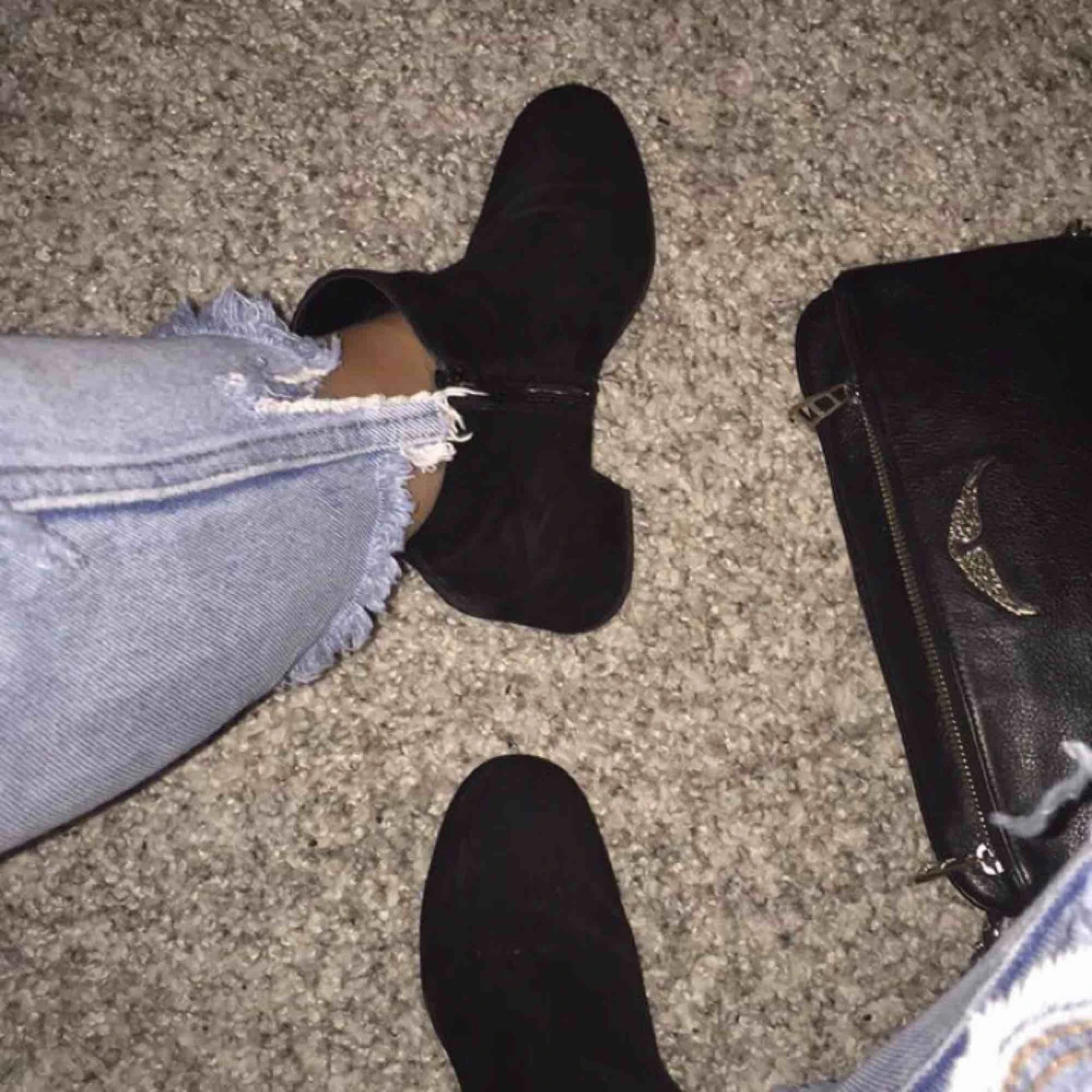 Svarta boots med låg klack från din sko. Mockaimitation :)