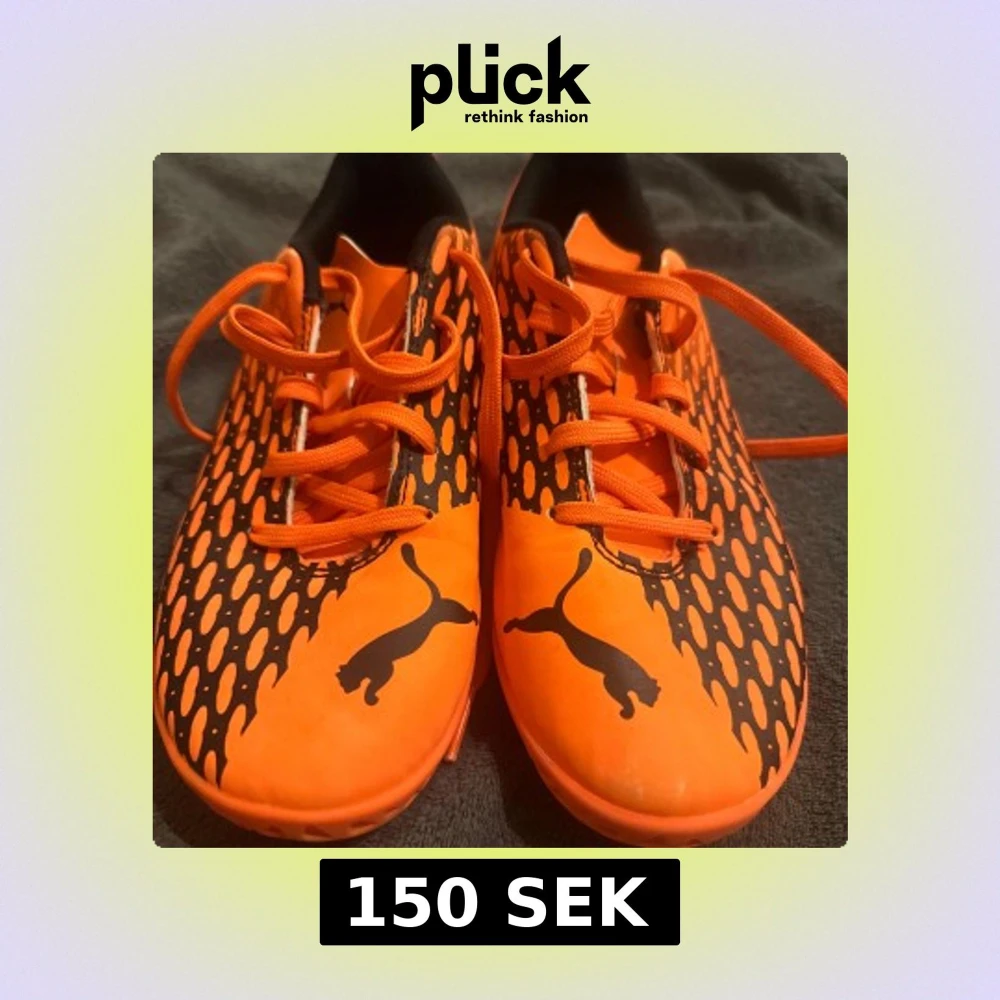 KNAPPT ANVÄNDA! Skorna blev snabbt små. Snygga orange fotbollsskor från Puma med svart mönster och snörning. Skorna har en slitstark sula med bra grepp och är perfekta för fotbollsträning. Den ikoniska Puma-loggan syns tydligt på sidan och sulan.
