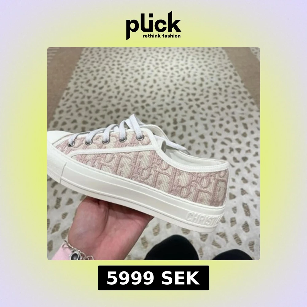 Snygga sneakers från Dior i beige och vitt med ikoniskt mönster och broderad logga. Skorna har vit snörning, platt sula och rund tå. Perfekta för dig som vill ha en exklusiv och trendig look.