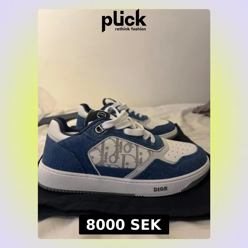 Säljer ett par Dior sneakers i blått och vitt med tydligt Dior-monogram på sidan. Skorna har snörning, perforerad tå och platt sula. Materialmix av denim och skinn ger en lyxig vibe. Grå och vit yttersula med Dior-logga undertill. Perfekt för dig som gillar exklusiva sneakers.