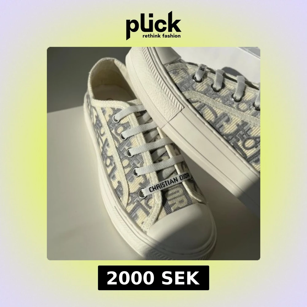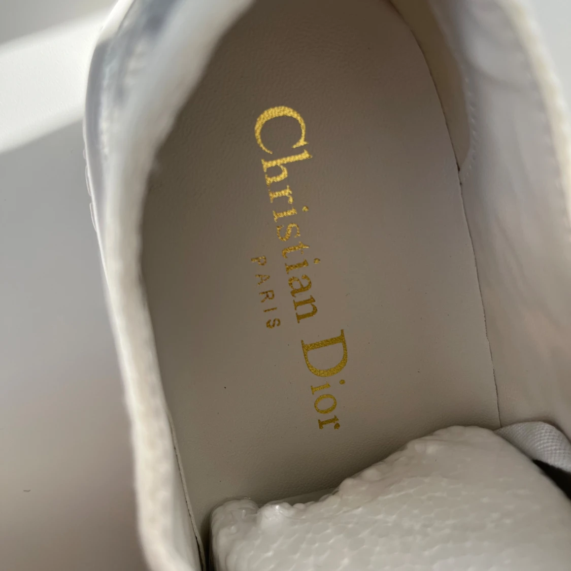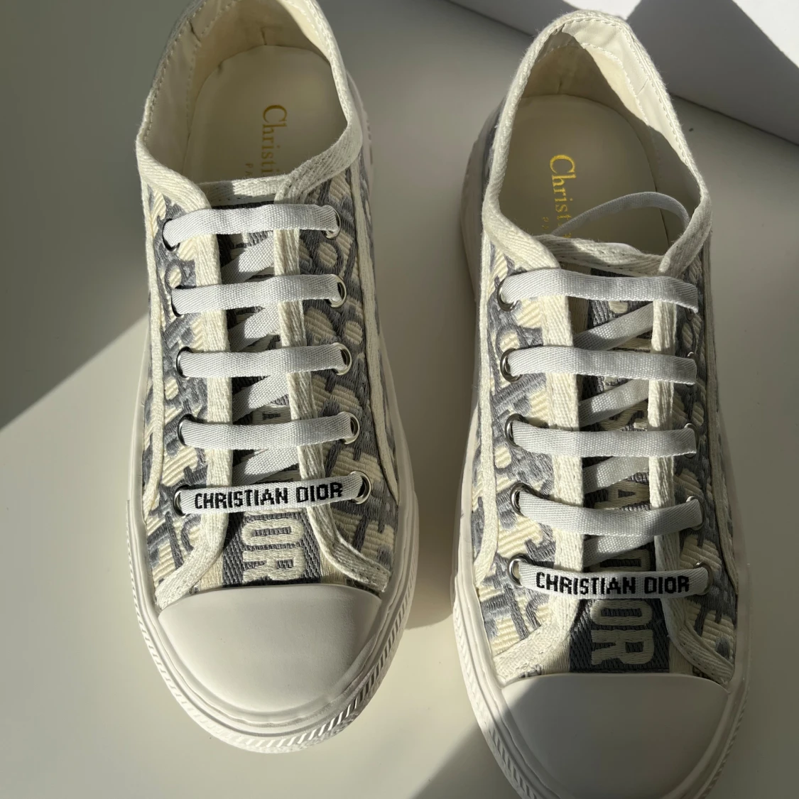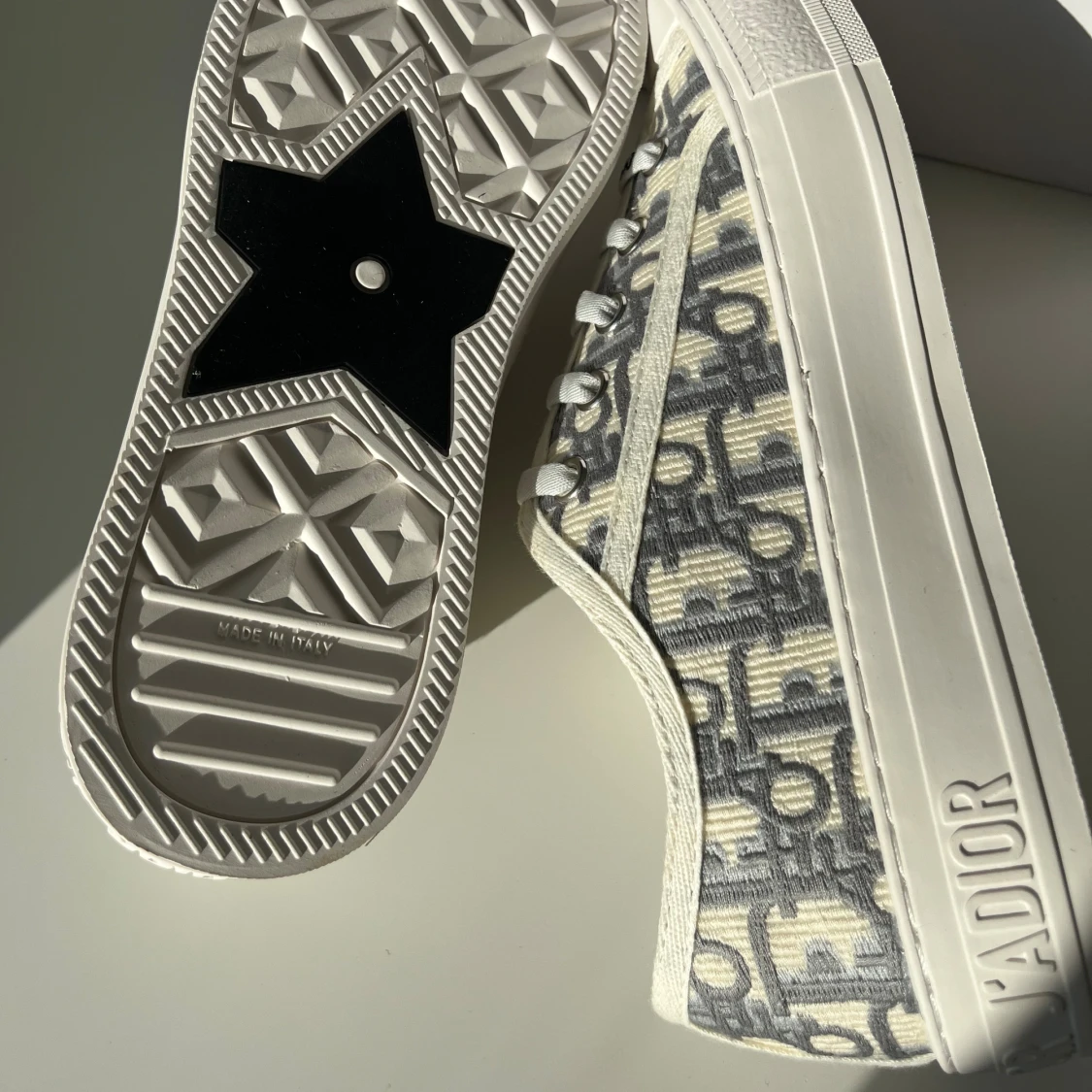 Snygga sneakers från Christian Dior med grått och vitt monogrammönster, platt sula och rund tå. Skorna har snörning med vita skosnören och detaljer med logotypen på tungan. Tillverkade i textil och skinn, med cool stjärndetalj under sulan.