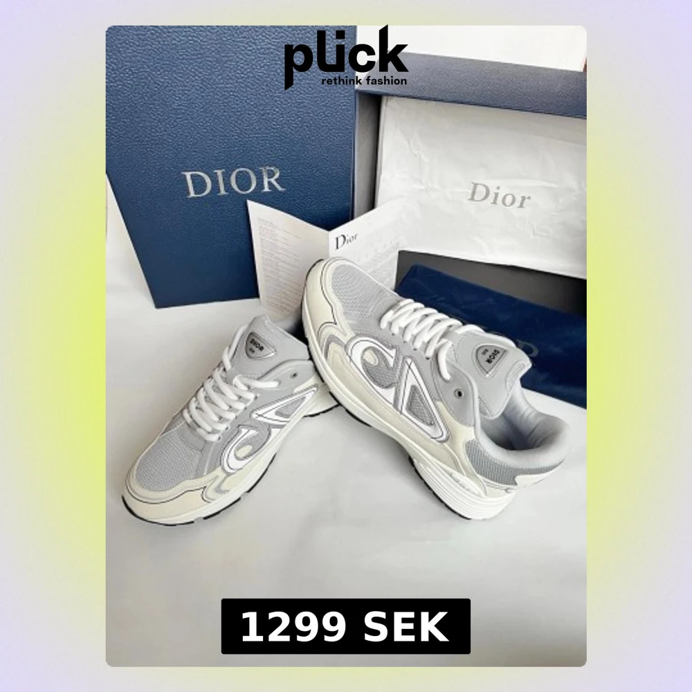 Snygga sneakers från Dior i grått och vitt med coola detaljer och logga på plösen. Skorna har en chunky sula, meshpaneler och vita snören. Perfekta för dig som vill ha en exklusiv och trendig look.