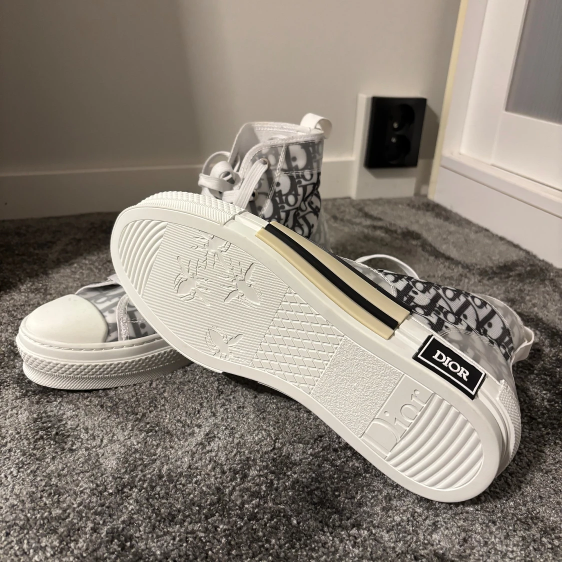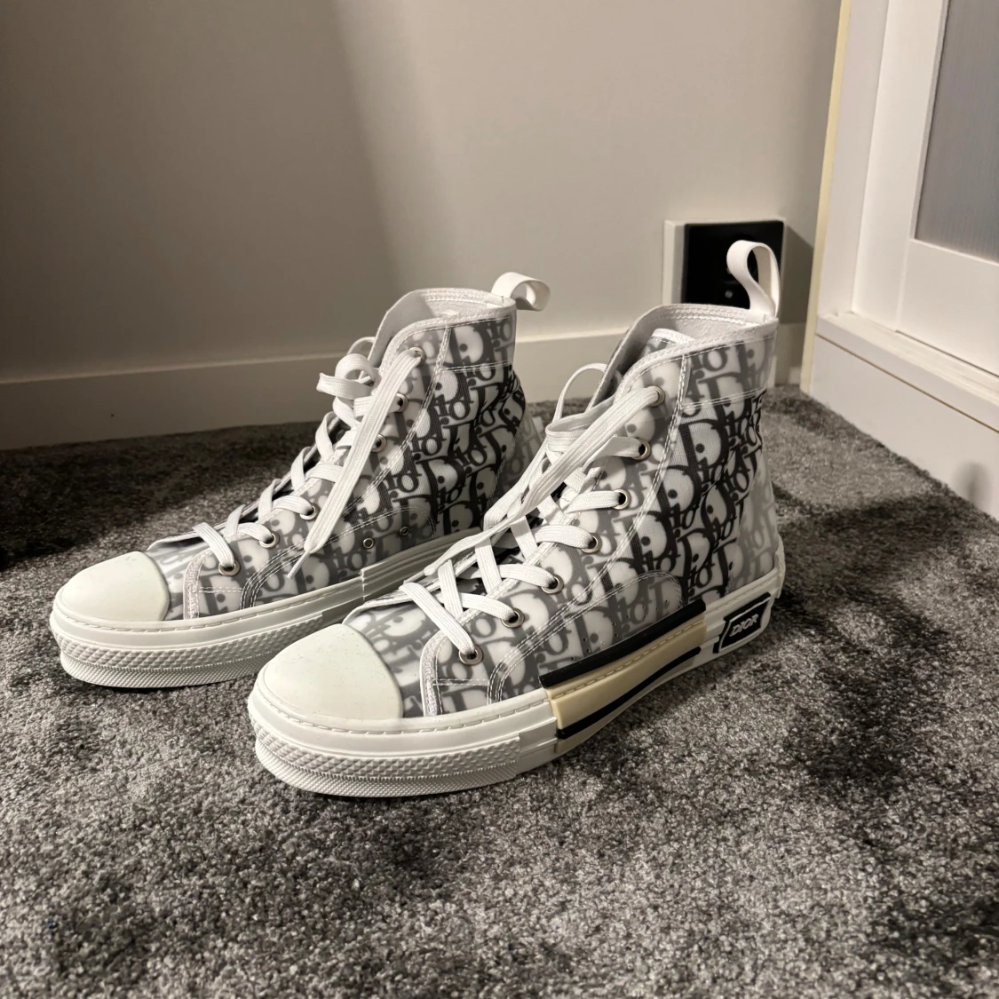 Snygga Dior B23 high top sneakers med ikoniskt monogrammönster i grått och vitt. Skorna har vit gummisula med Dior-logga på sidan, snörning och genomskinliga paneler. Perfekta för dig som vill sticka ut med lyxig streetstyle.
