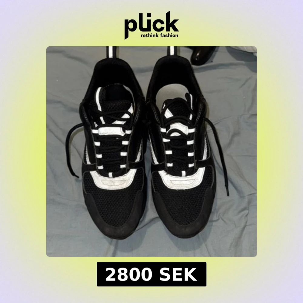 Chunky svarta Dior sneakers med vita detaljer och reflekterande inslag. Ovandel i mesh och skinn, med kraftig sula och snörning. Snygg sportig vibe och tydlig Dior-logga på sidan. Perfekta för dig som gillar statement-sneakers med exklusiv känsla.