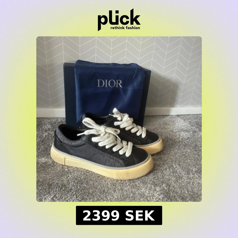 Säljer ett par svarta Dior sneakers med diskret monogrammönster på sidorna, tjocka vita snören och beige sula. Skorna har en klassisk låg profil och är tillverkade i en mix av skinn och textil. Perfekta för dig som vill ha en lyxig och stilren look. Dustbag och boxen tillkommer vid köp. Kvitto finns som autentiskt bevis!