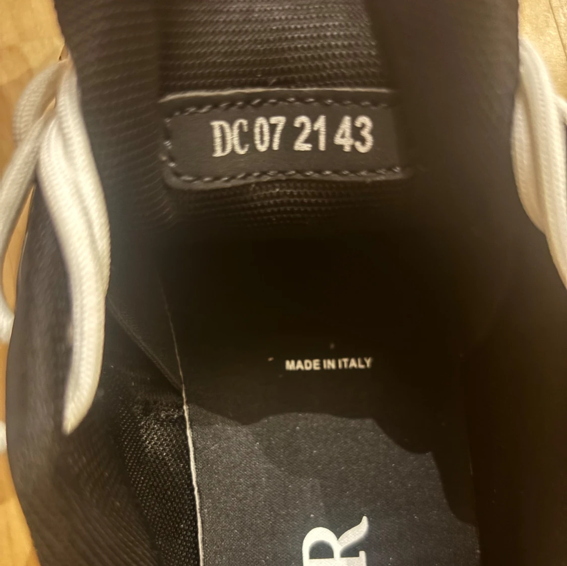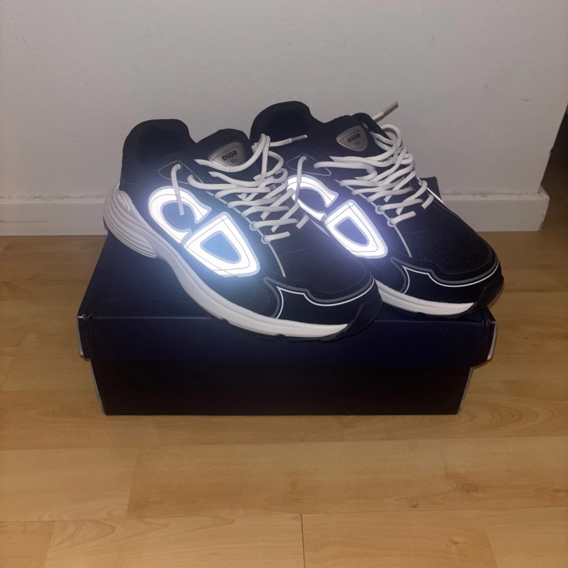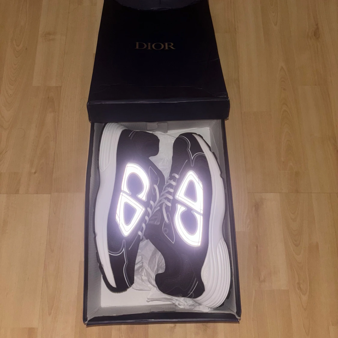 Säljer ett par svarta Dior sneakers med vita snören och fet reflekterande CD-logga på sidorna. Skorna har en chunky vit sula. Grymma detaljer och riktigt snygg siluett, perfekta för dig som vill sticka ut.