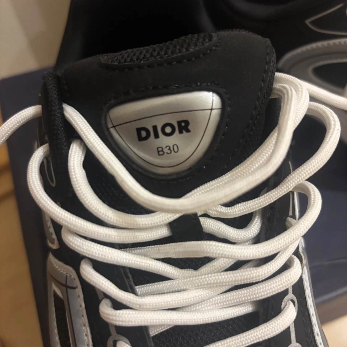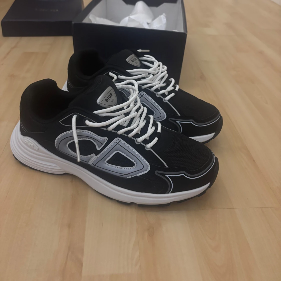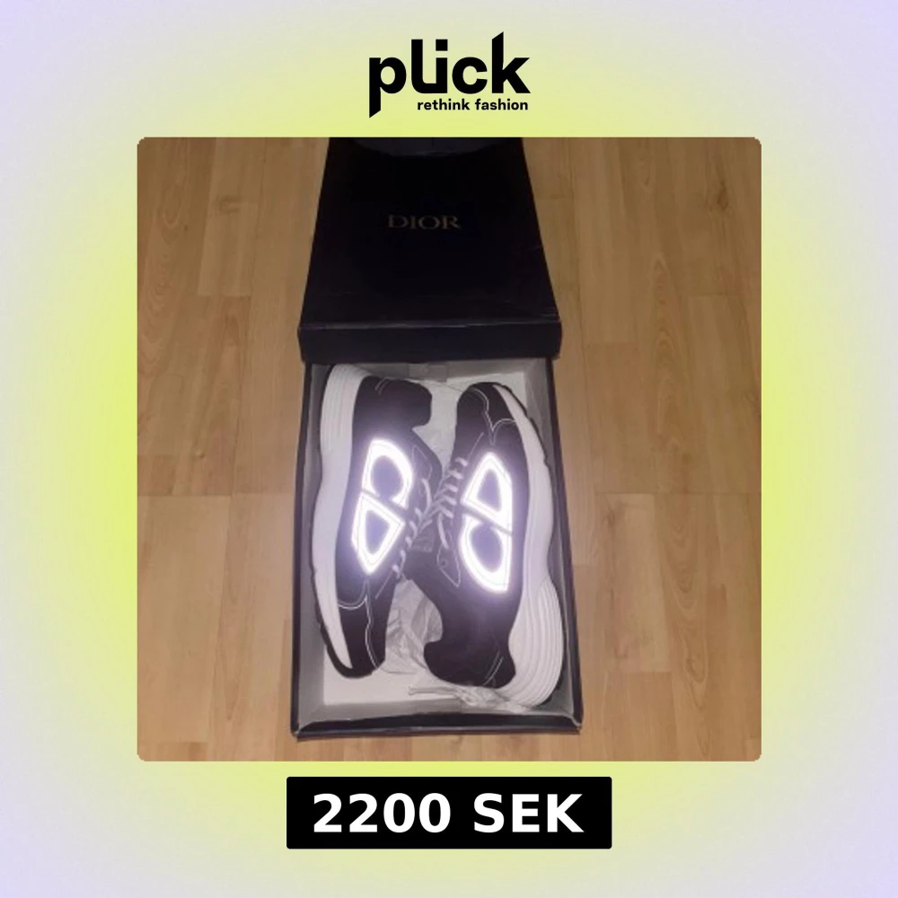 Säljer ett par svarta Dior sneakers med vita snören och fet reflekterande CD-logga på sidorna. Skorna har en chunky vit sula. Grymma detaljer och riktigt snygg siluett, perfekta för dig som vill sticka ut.