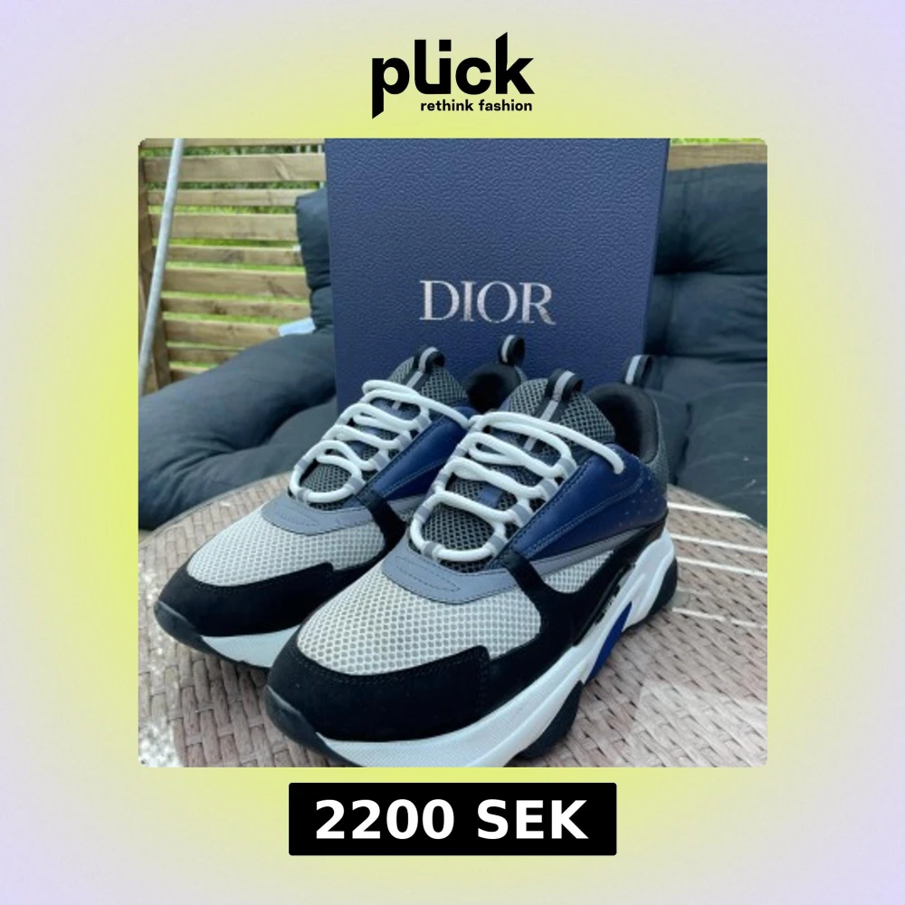 Säljer ett par Dior B22 sneakers med chunky sula, mesh i grått och detaljer i blått och svart skinn. Skorna har vita snören och coola paneler i olika material. Perfekt för dig som gillar lyxiga och trendiga sneakers med statement-look.