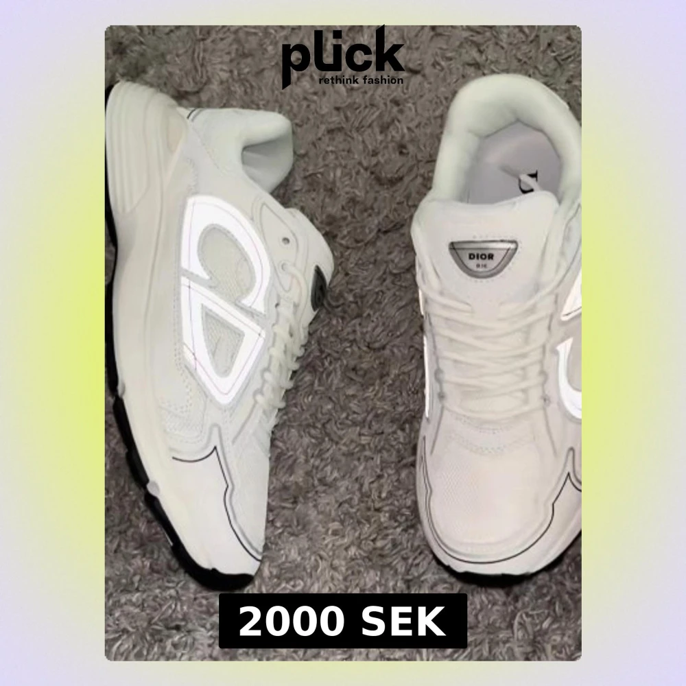 Säljer ett par vita Dior B30 sneakers med reflekterande detaljer och tydlig Dior-logga på sidan. Skorna har en chunky sula, meshpaneler och snygga kontrastsömmar. Perfekta för dig som vill ha en clean och exklusiv look.