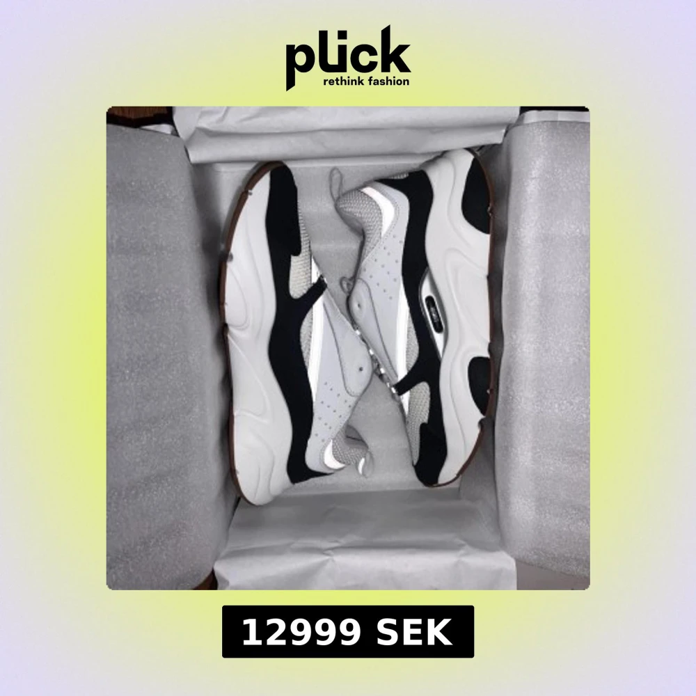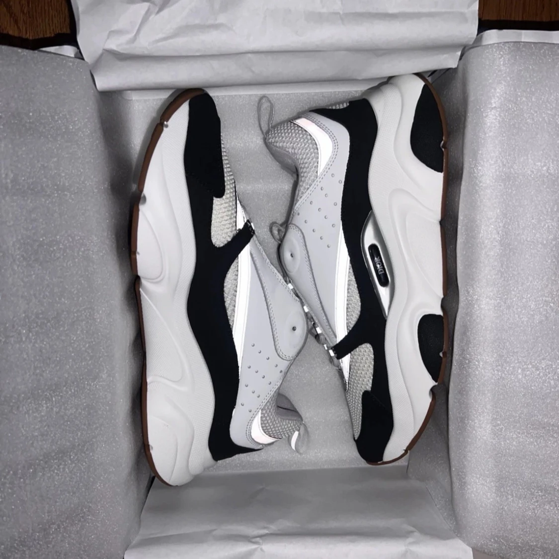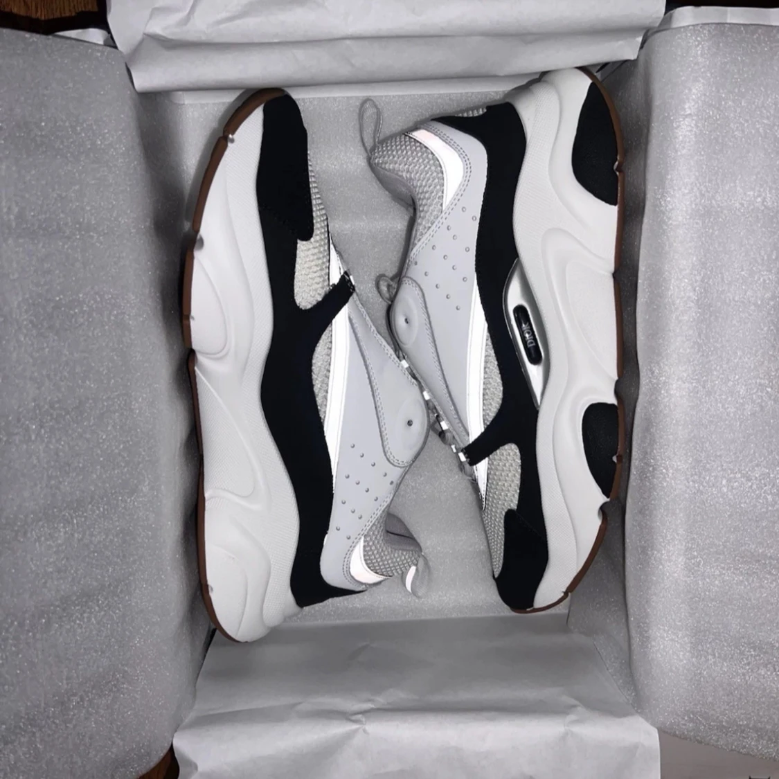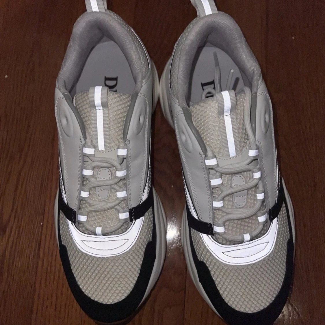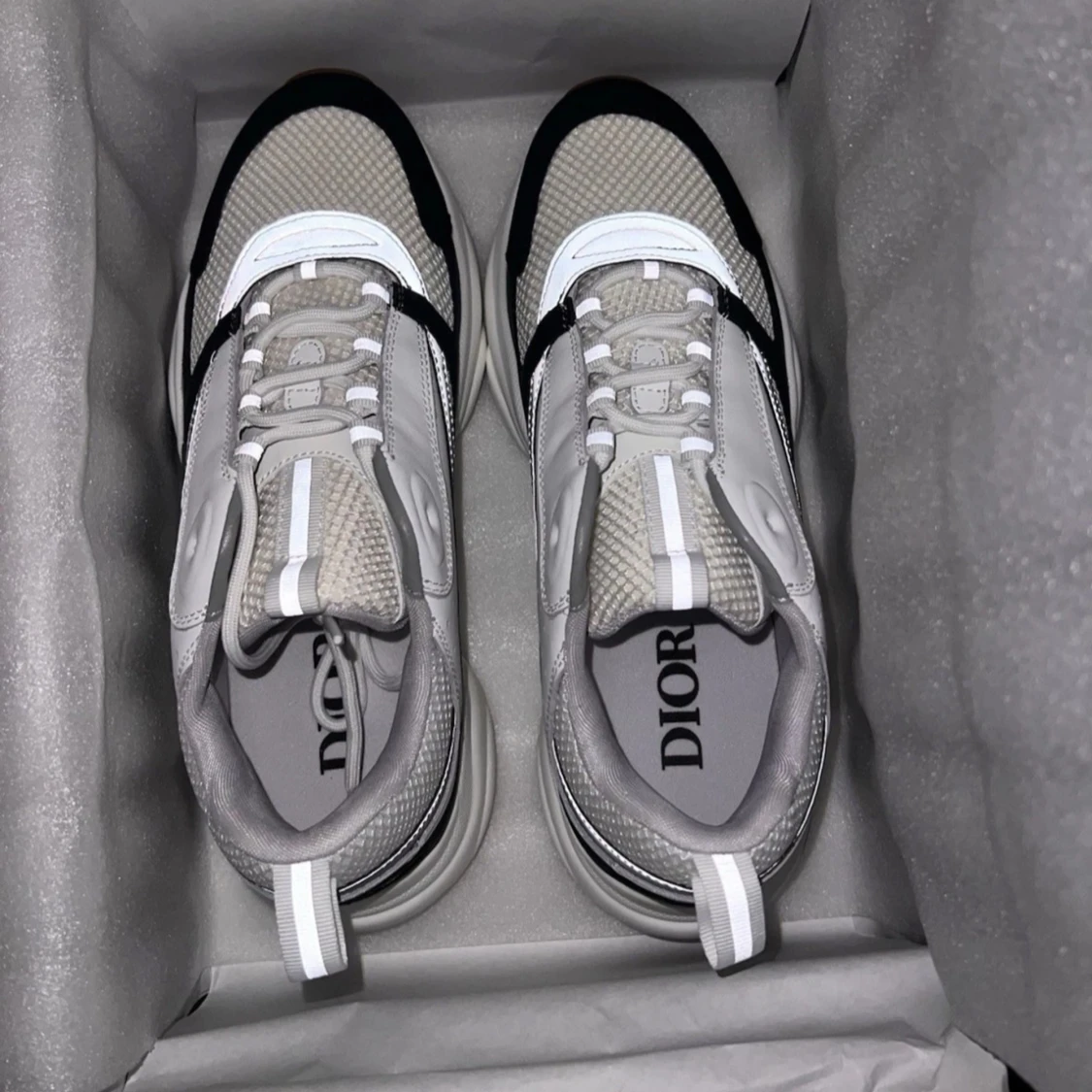 Säljer ett par Dior B22 sneakers med chunky silhuett i grått, svart och vitt. Ovandel i mesh och skinn med coola paneler och vita detaljer. Sulan är tjock och har en brun undersida med CD-logga. Skorna har snörning och reflekterande detaljer för extra stil.