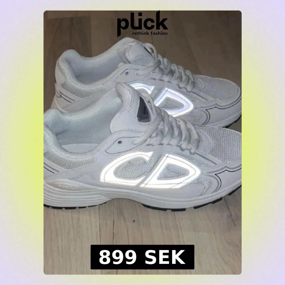 Säljer ett par vita b30 sneakers med stora reflexdetaljer och CD-logga på sidorna och hälen. Skorna har snörning, meshpaneler och robust platt sula. Snyggt sportig design med inslag av silver och grått, perfekt för dig som gillar exklusiva märken och streetstyle. Priset är ej hugget i sten!