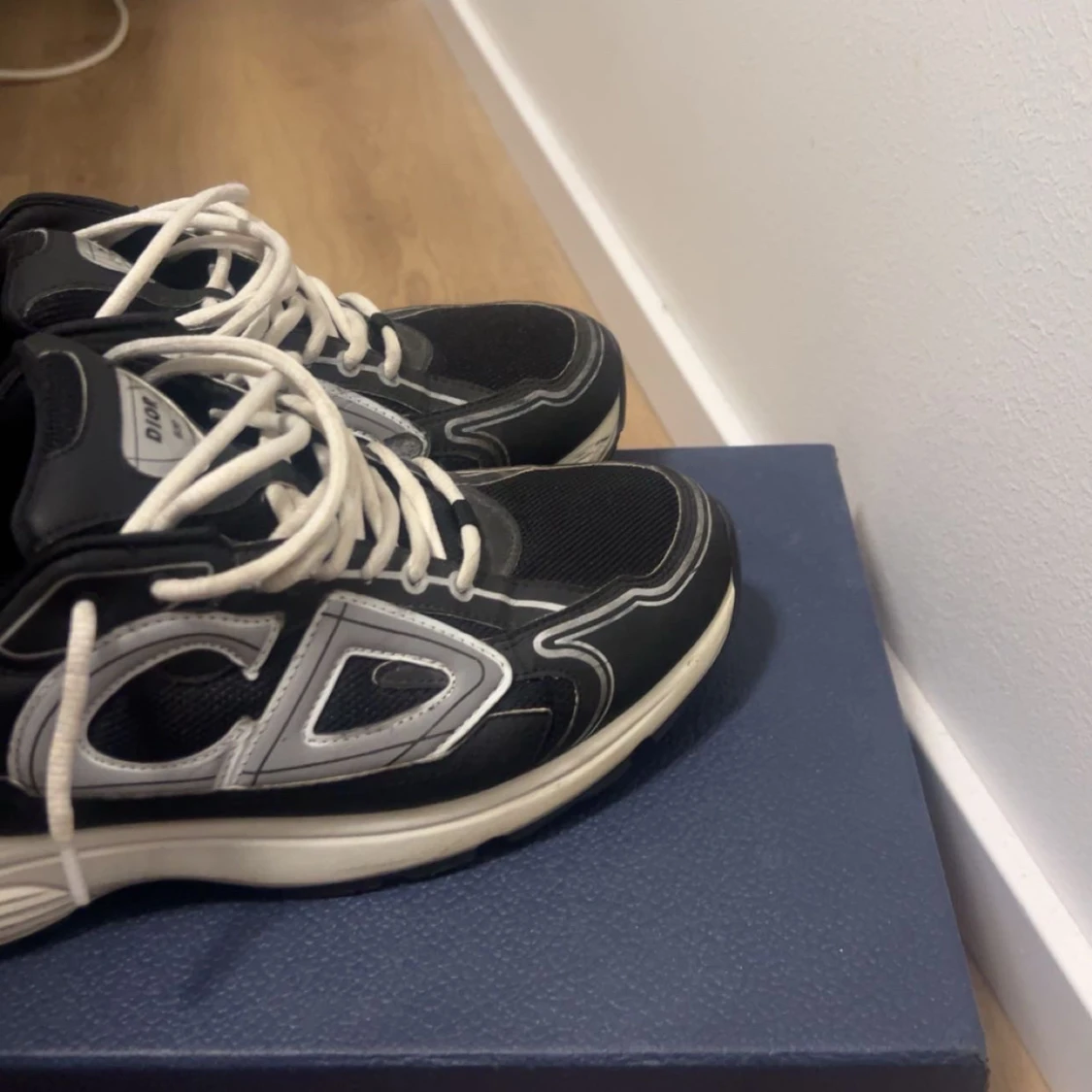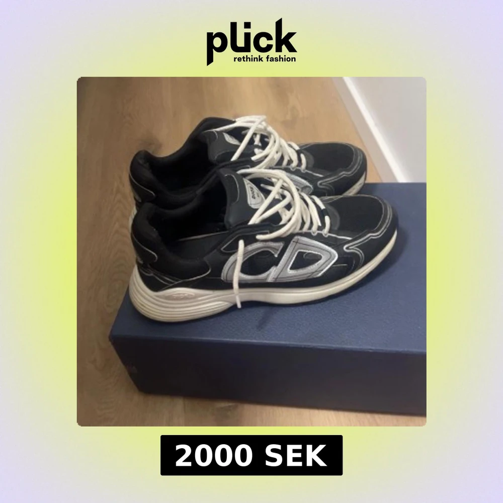 Snygga svarta Dior sneakers med vita snören och kontrasterande vita detaljer. Skorna har en chunky sula och stora CD-loggor på sidan. Ovandelen är i en mix av skinn och textil för en modern look. Perfekta för dig som vill sticka ut med exklusiva sneakers. Box och skosnören kommer med
