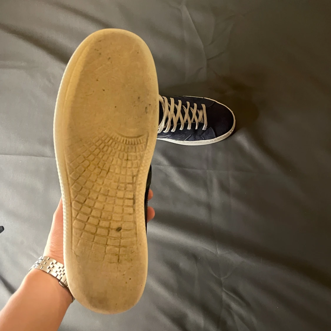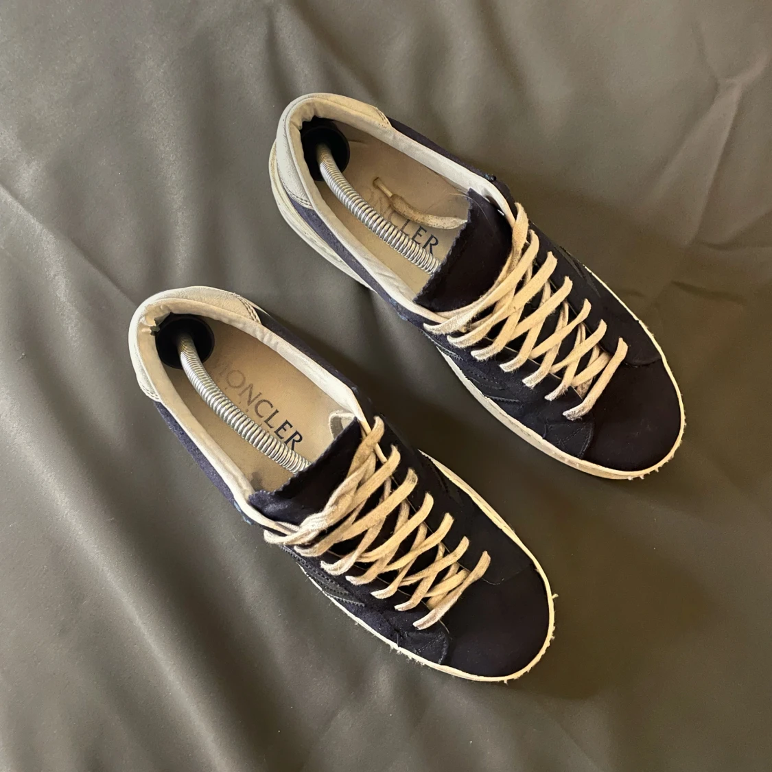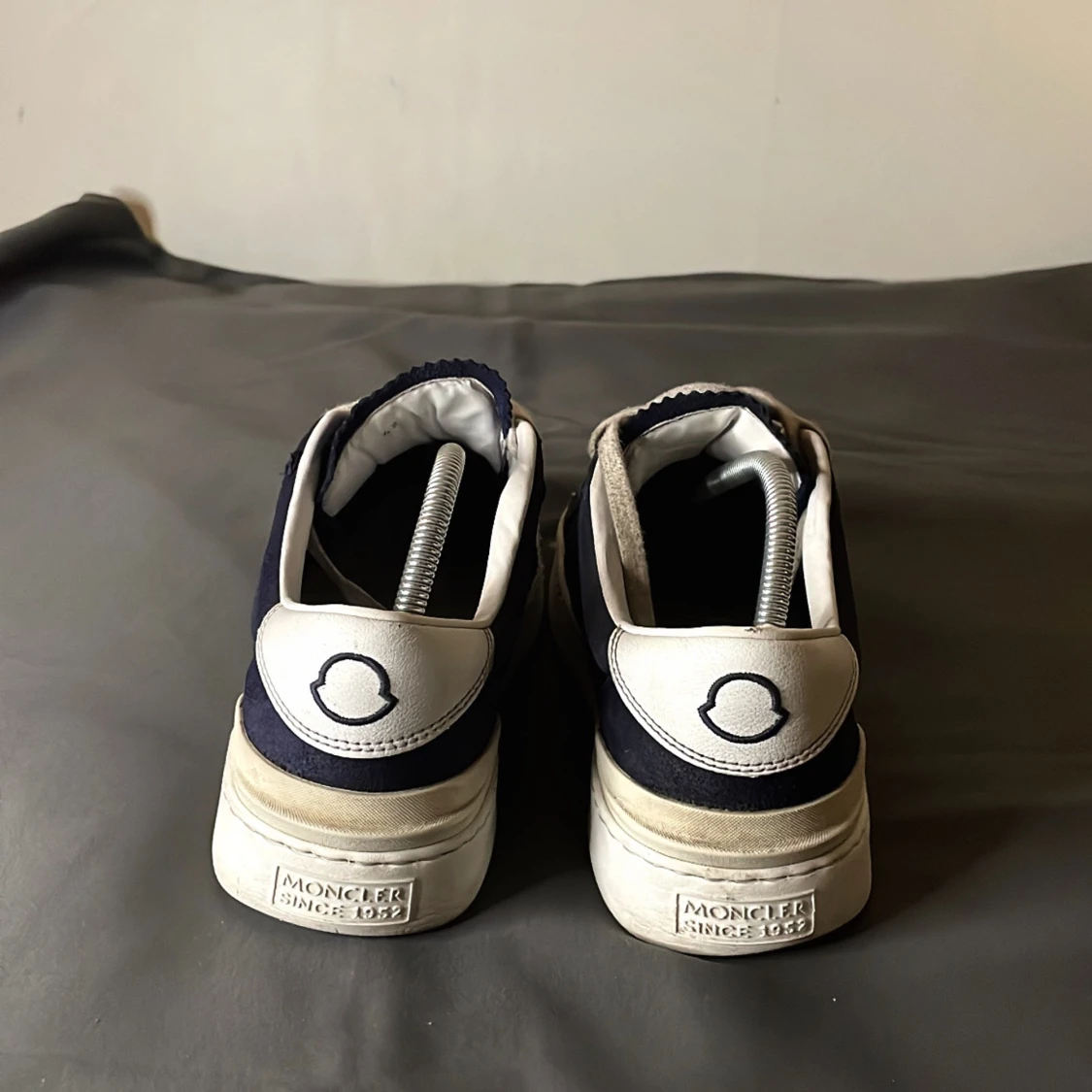 Snygga mörkblå sneakers från Moncler i marinblått vita detaljer och vita snören och Moncler-logga på sidan och hälen. Perfekta för dig som gillar stilrena och exklusiva sneakers med premiumkänsla. väldigt bekväma från skillnad till andra märkes skor, väldigt svåra att få tag på,