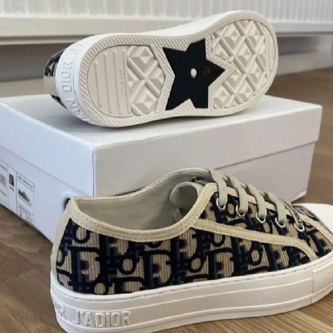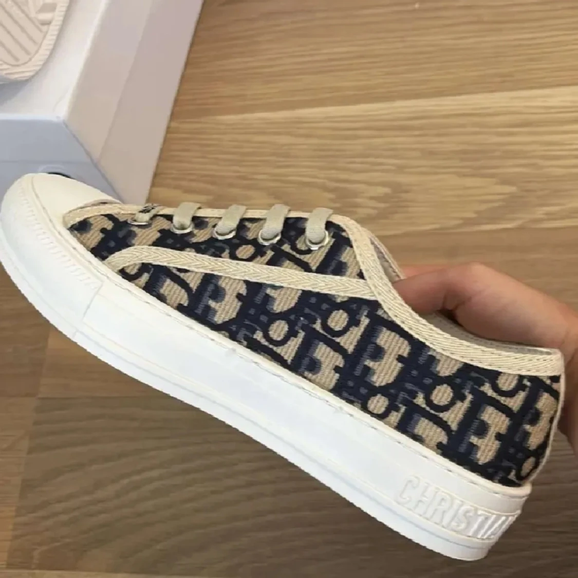 Snygga Dior sneakers med beige och marinblått monogrammönster, vita sulor och snörning. Skorna har tydlig Dior J'ADIOR-logga på sulan och är tillverkade i canvas med detaljer i bomull. Perfekta för dig som vill sticka ut med lyxig streetstyle.