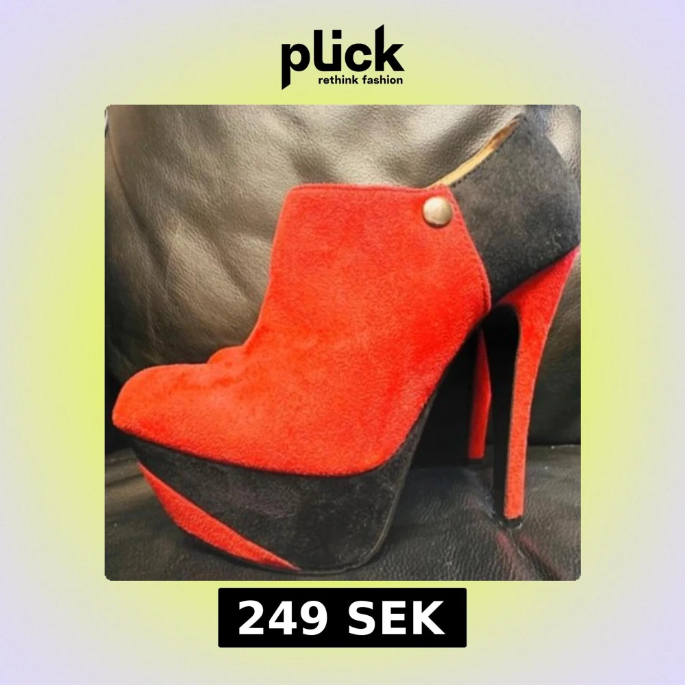 Supercoola stövletter i svart och rött mockaimitationsmaterial från Platino. Djärv 80/90-talsinspirerad retrostil med skyhög klack (12,5 cm, varav 4 cm platå). Dragkedja på insidan för enkel på- och avtagning. I mycket fint skick – perfekta för dig som gillar rockabilly, retro eller alternativ stil. Ingen prutning – men bundlerabatt erbjuds!