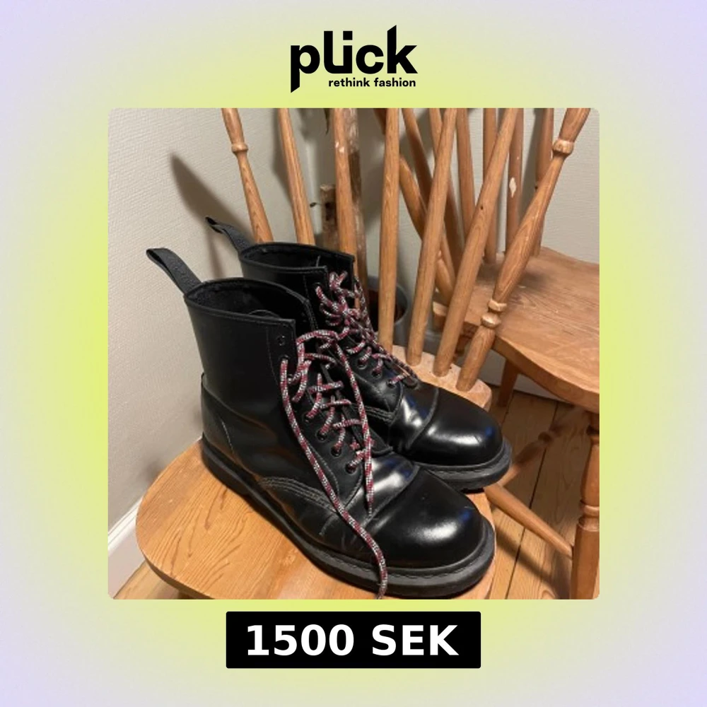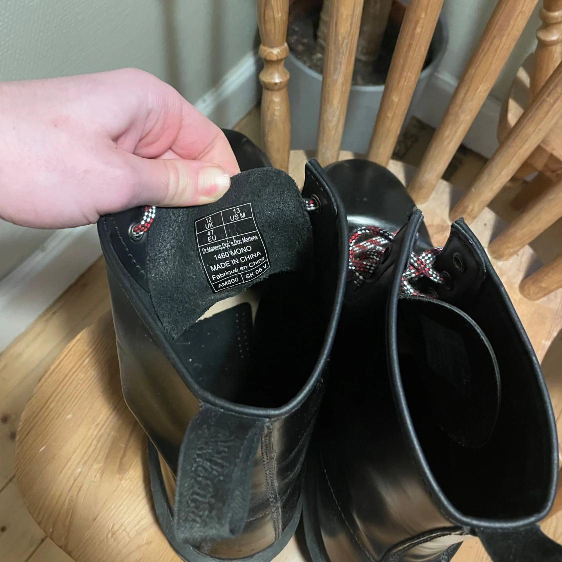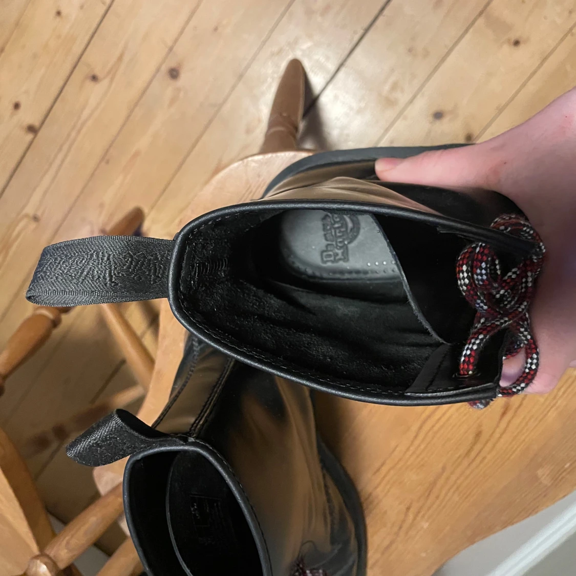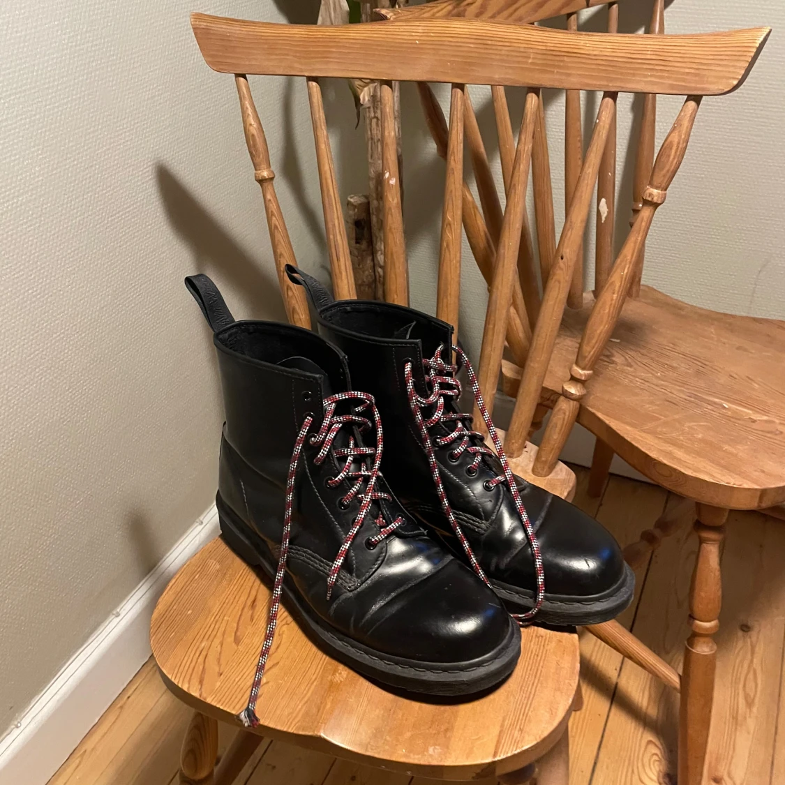 Säljer ett par klassiska svarta Dr. Martens boots med röd- och vitmönstrade snören. Skorna är tillverkade i skinn och har en robust design med dragflik baktill för enkel påtagning. Storlek 47. Knappt använda