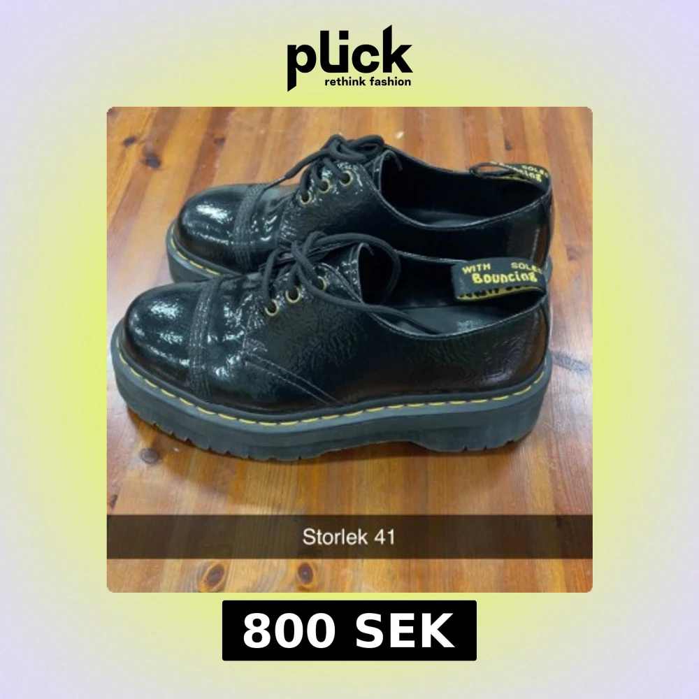 Säljer ett par svarta Dr. Martens platåloafers i glansigt skinn med snörning och grov sula. Skorna har gul kontrastsöm runt sulan och klassisk Dr. Martens-flärp bak. Perfekta för dig som vill sticka ut med chunky skor.