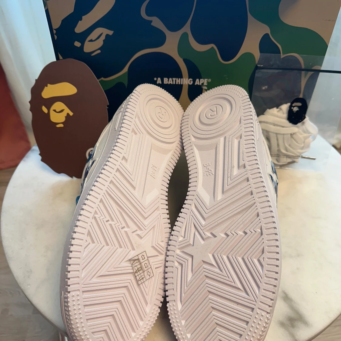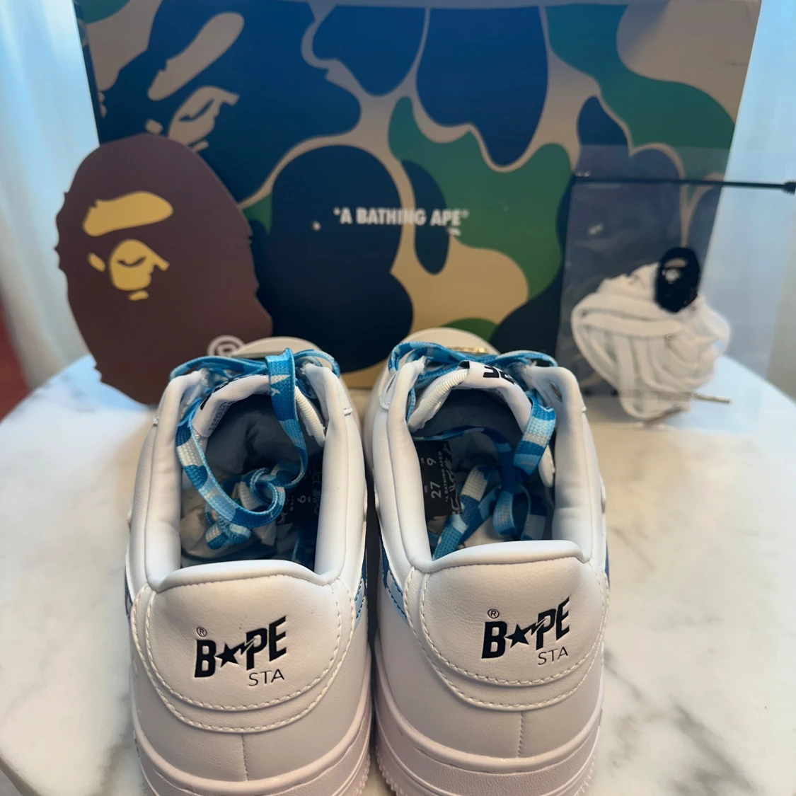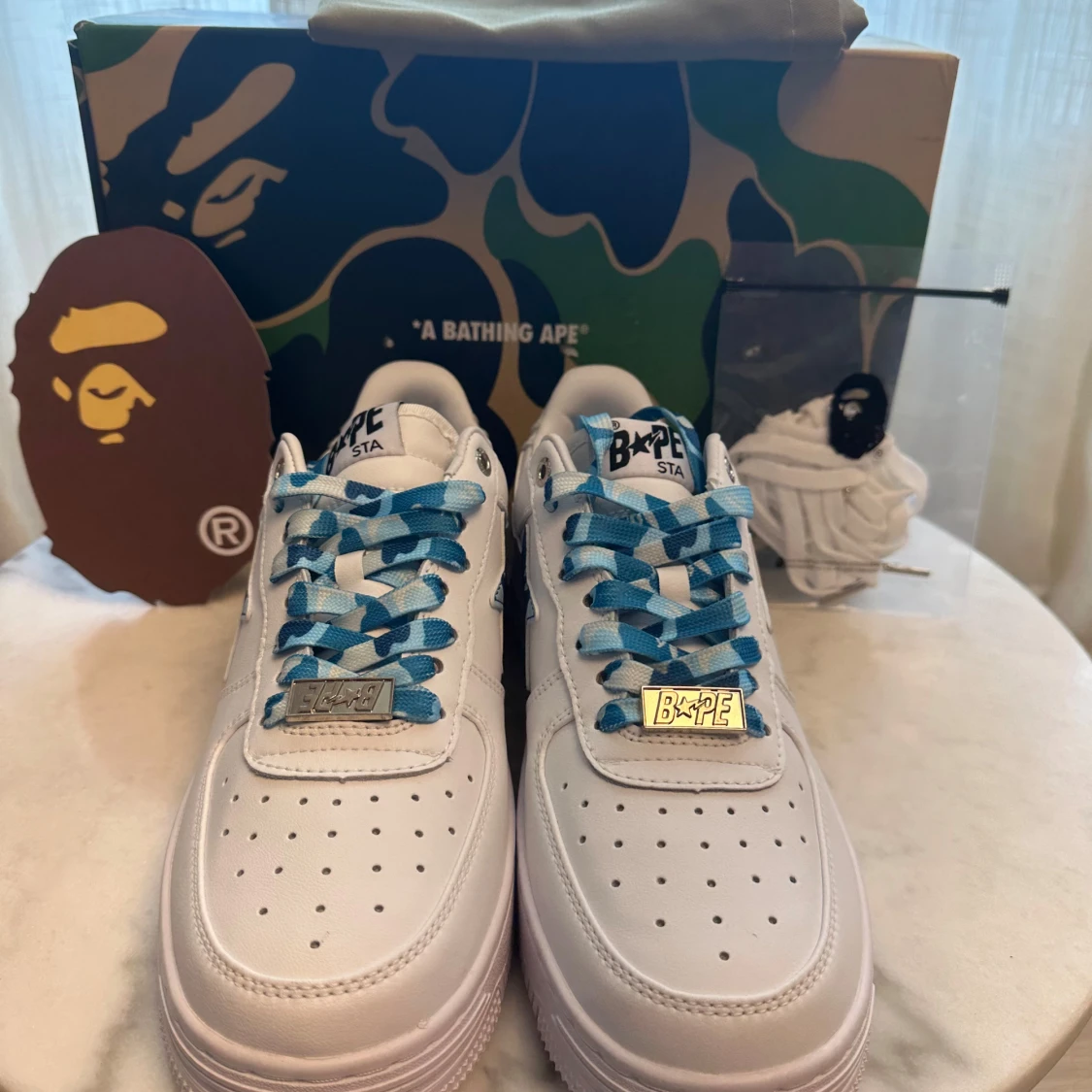 Helt nya Bapesta ”Blue Camo” i storlek 42,5. Sko med blått camo-mönster och toppkvalitet. Säljs med originalbox och extra snören.
