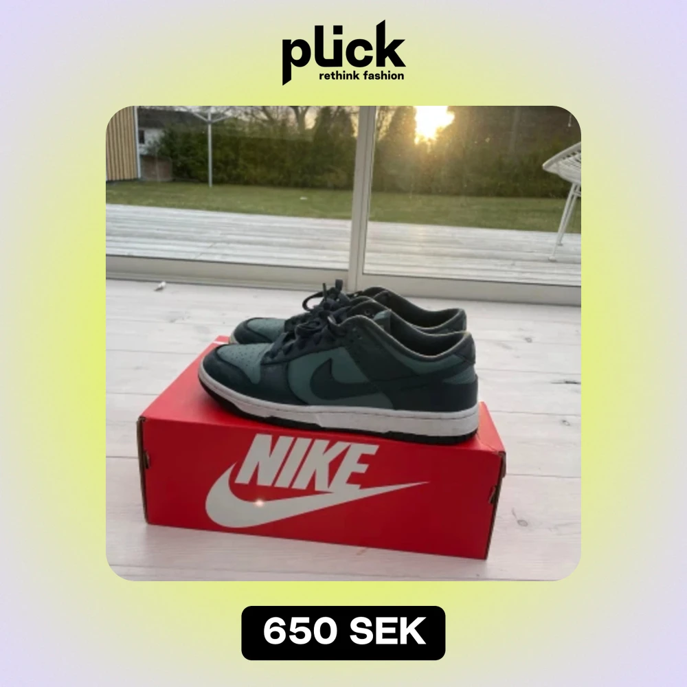 Säljer mina Nike dunk low skick är 8/10 för att det är lite cress på framsidan storlek 43 blå grön skriv vid frågor kan tänka mig att gå ner i pris vi snabb affär