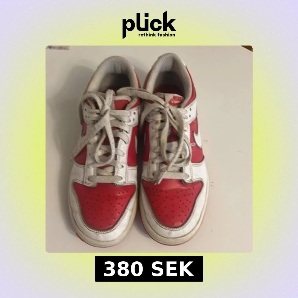 Säljer ett par Nike Dunk Low i rött och vitt. Skorna har klassisk låg siluett, vit sula och röd yttersula. Säljs i använt skick. Några slitningar men inget som märks på håll