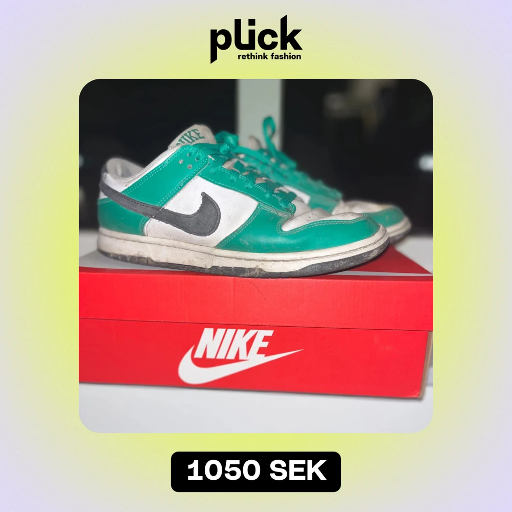 Säljer ett par Nike Dunk Low 'Celtics' i grönt och vitt. Skorna har en klassisk design med svart swoosh och gröna snören. De är i bra skick men har lite slitage på insidan. Perfekta för vardagsbruk eller för att komplettera din sneaker-samling!