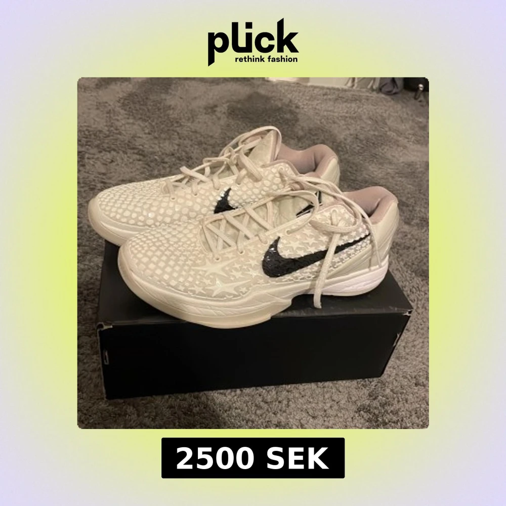 Nike Kobe VI Protro sneakers i färgen sail/black-light bone-white. Skorna har ett unikt mönster med 3D-liknande struktur och stjärndetaljer, svart Swoosh på sidan och Kobe-logga på plösen och sulan. Lågt skaft, snörning och platt sula.Skorna har såklart kvitto om det behövs. Använda max 5 träningar då dom var för små. Nästan helt nya. Pris ej hugget i sten🪨🪨