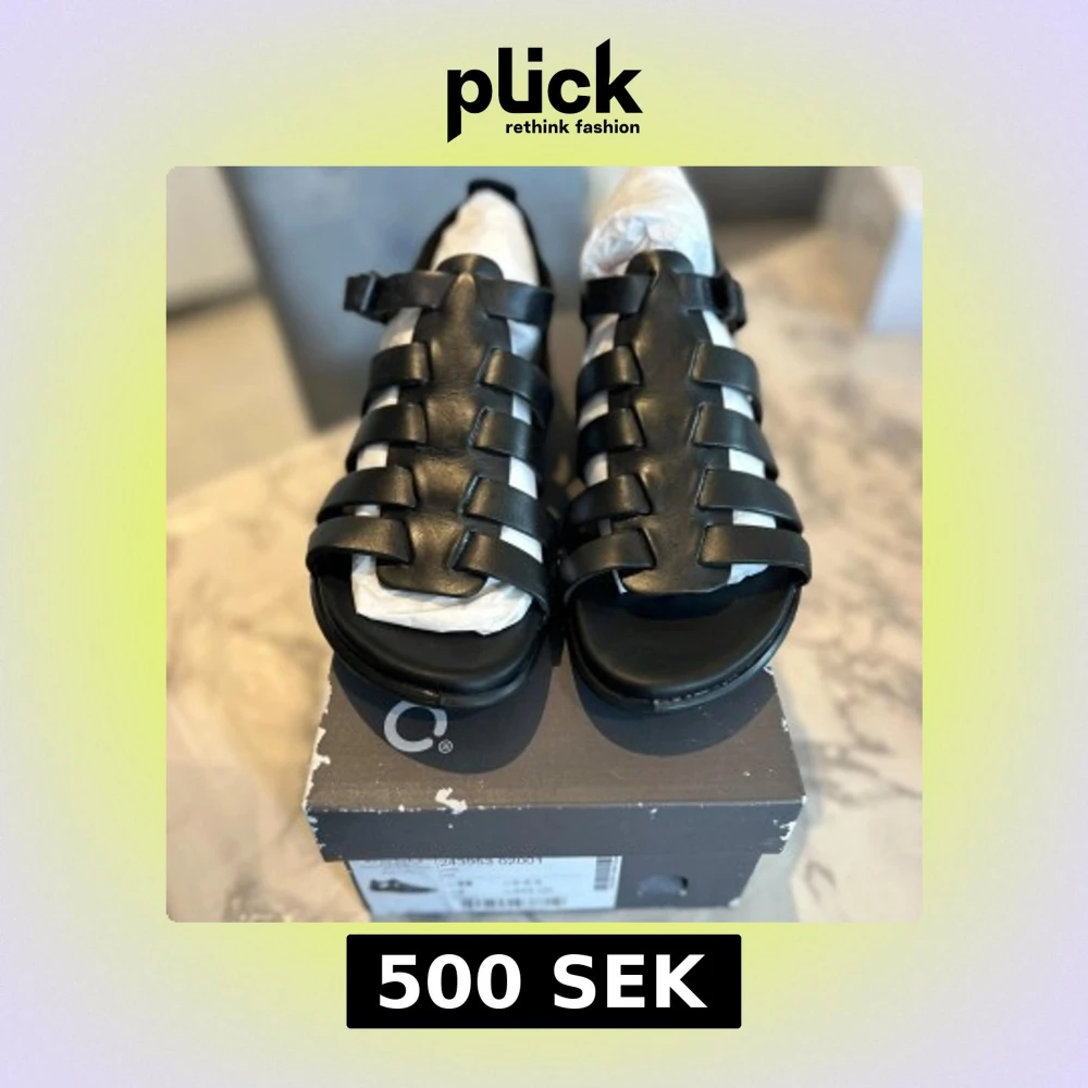 Helt nya och oanvända Svarta sandaler från ECCO. I äkta skinn med breda remmar och justerbart spänne vid ankeln. Platt sula och öppen tå, mycket bekväma, perfekt för varma dagar. Snyggt flätad design som passar till allt.