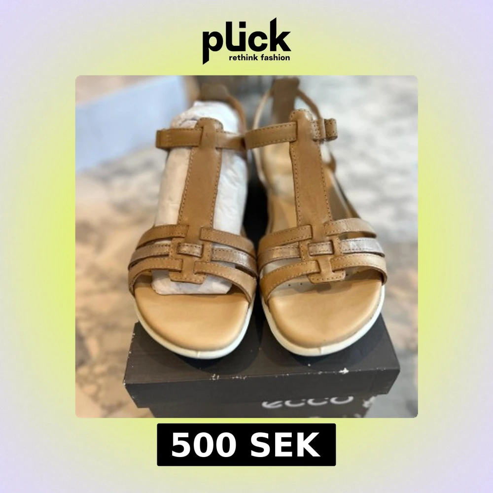 Helt nya och oanvända snygga sandaler från ECCO. I beige skinn med flera remmar och öppen tå. De har en klassisk T-rem-design och justerbar kardborre vid ankeln. Perfekta för varma dagar med sin platta sula.