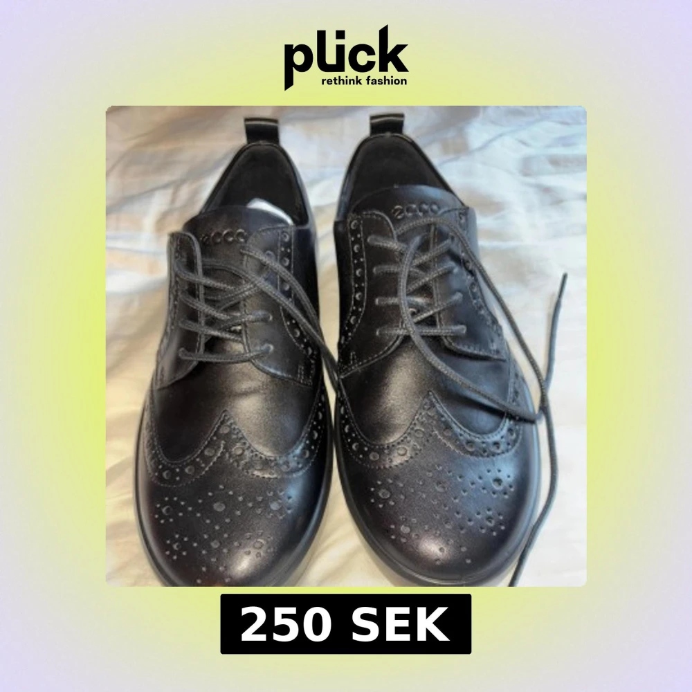 Säljer ett par svarta läderskor från Ecco med klassiskt broguemönster och snörning. Skorna har rund tå och platt sula, perfekta för en stilren look. Levereras i originalkartong.