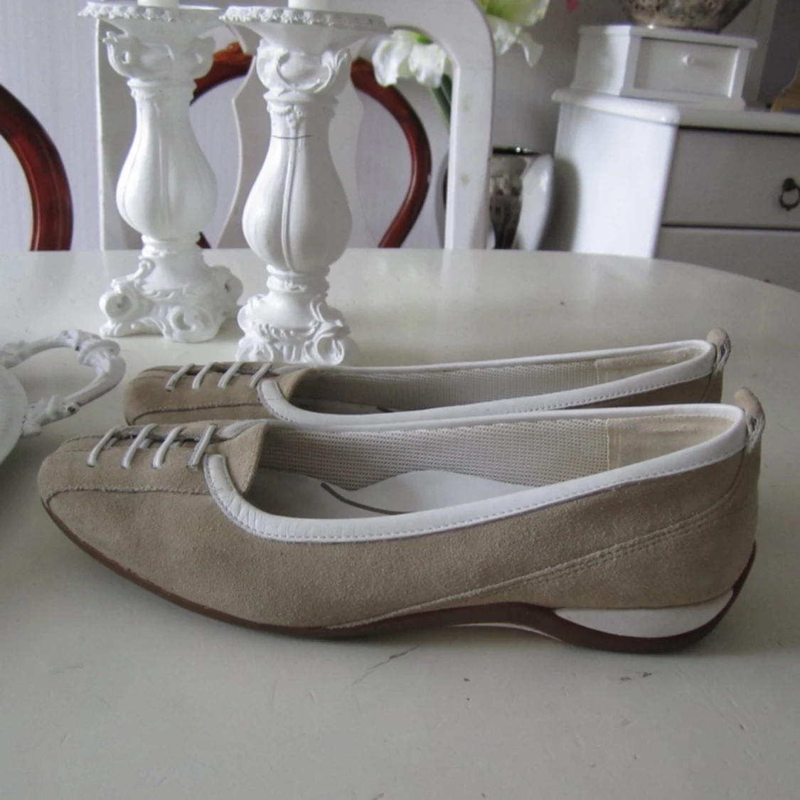 Snygga Ecco skor i beige mocka stl 39. Gummisula under, skinn inuti, mockan mörknat lite på vissa ställen. Innermått ca 26cm. Något smal i modellen, passar ej till breda fötter. Bra skick!