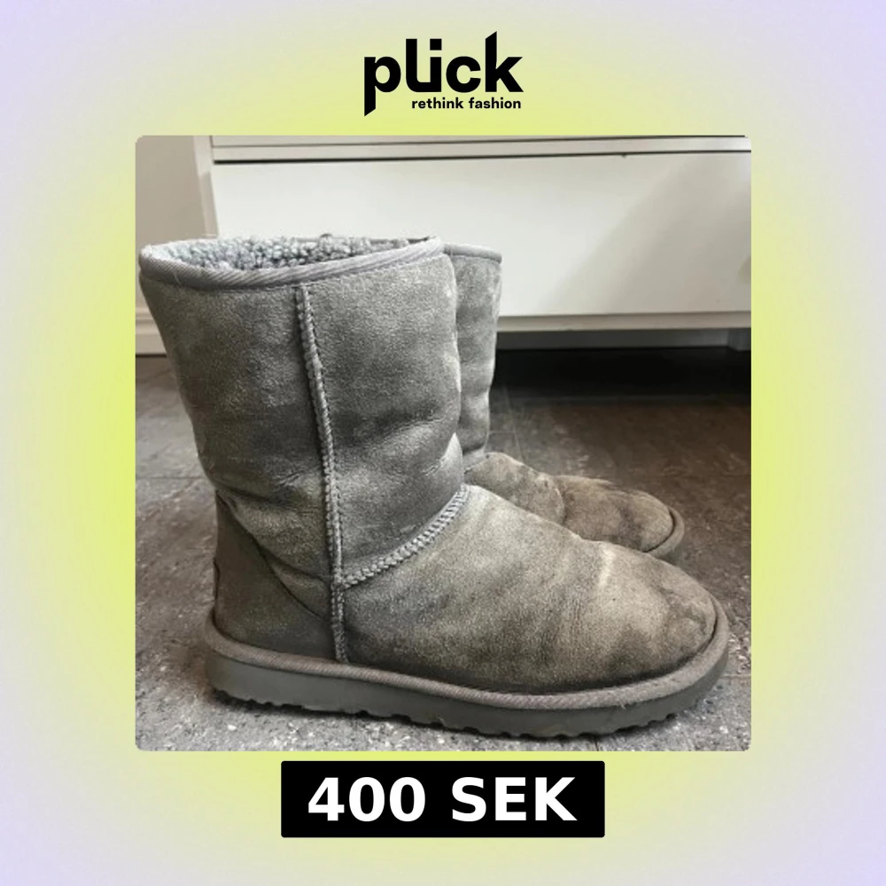 Mysiga grå UGG boots med rund tå och platt sula. Utsidan är i mjuk mocka och insidan är fodrad med fluffigt syntetmaterial som håller fötterna varma. Klassisk UGG-logga baktill och grov yttersula för extra komfort. Perfekt för kalla dagar.