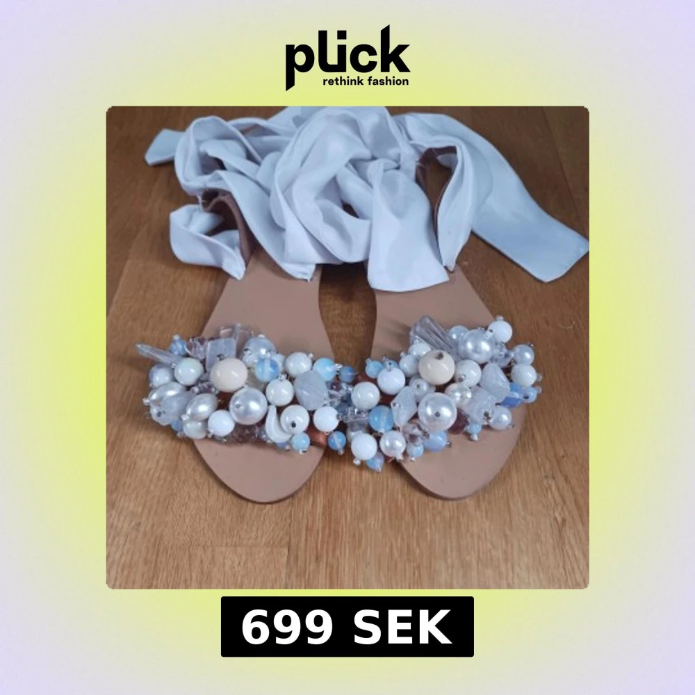 Unika sandaler med beige sula och vita band att knyta runt vristen. Framtill dekorerade med stora pärlor och stenar i vitt, blått och silver. Perfekta för dig som vill sticka ut med detaljerade accessoarer. Storlek 38. Helt nytt skick aldrig använda. Nypris 2500kr pris går att diskutera.