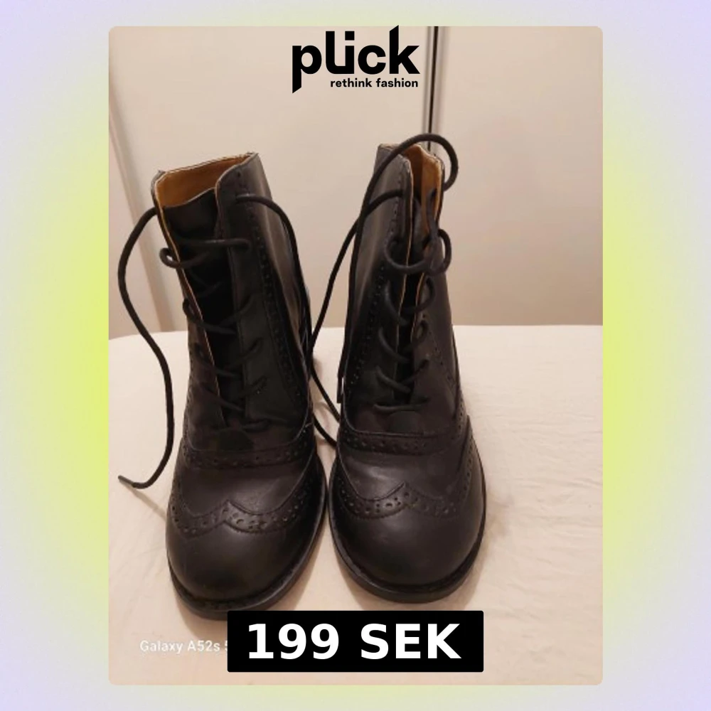 Säljer ett par svarta boots från Ellos i storlek 37. Skorna har klassisk brogue-mönstrad design, snörning framtill och låg klack. Tillverkade i skinnimitation med rund tå och snygga detaljer längs kanterna. Perfekt för dig som gillar stilrena och tidlösa skor.