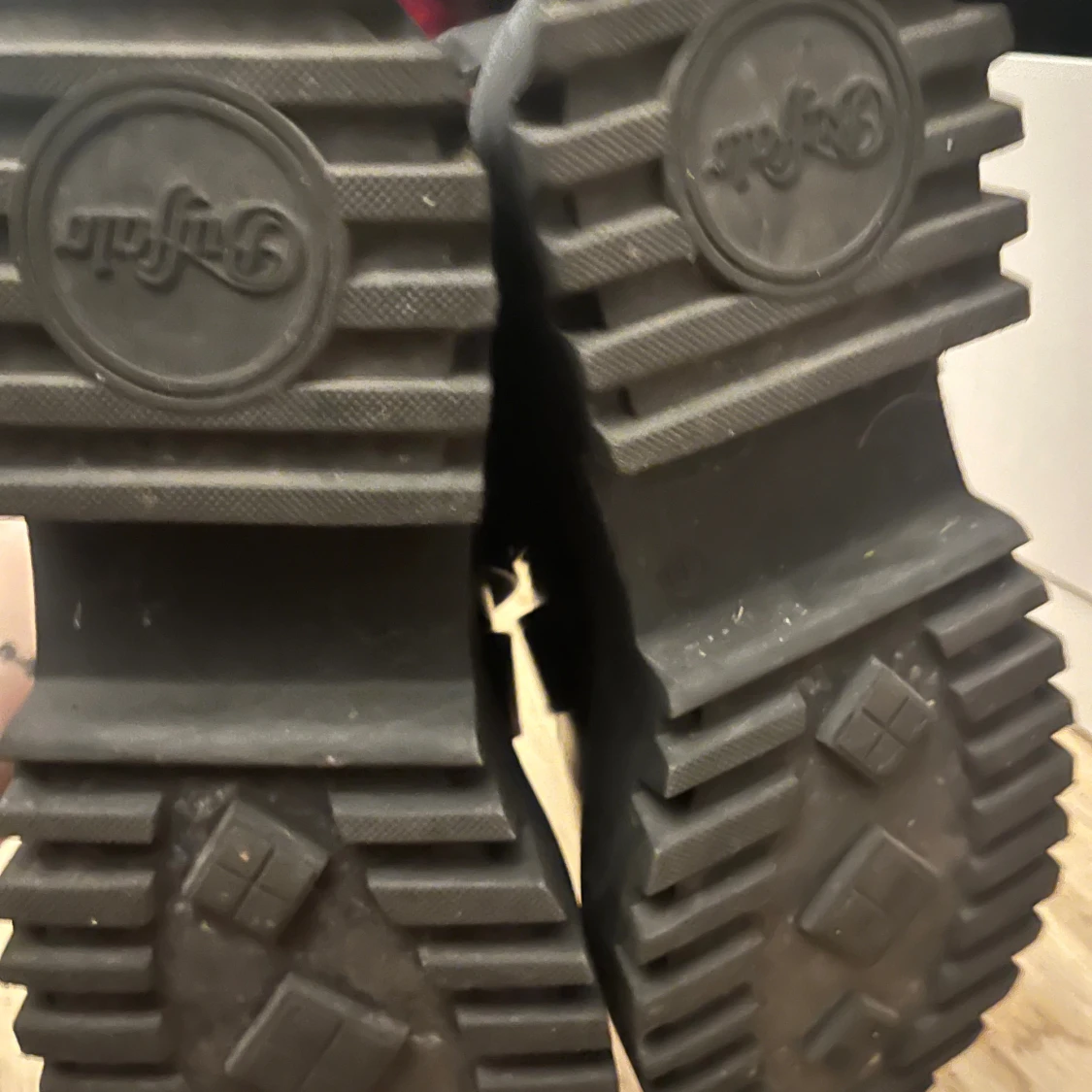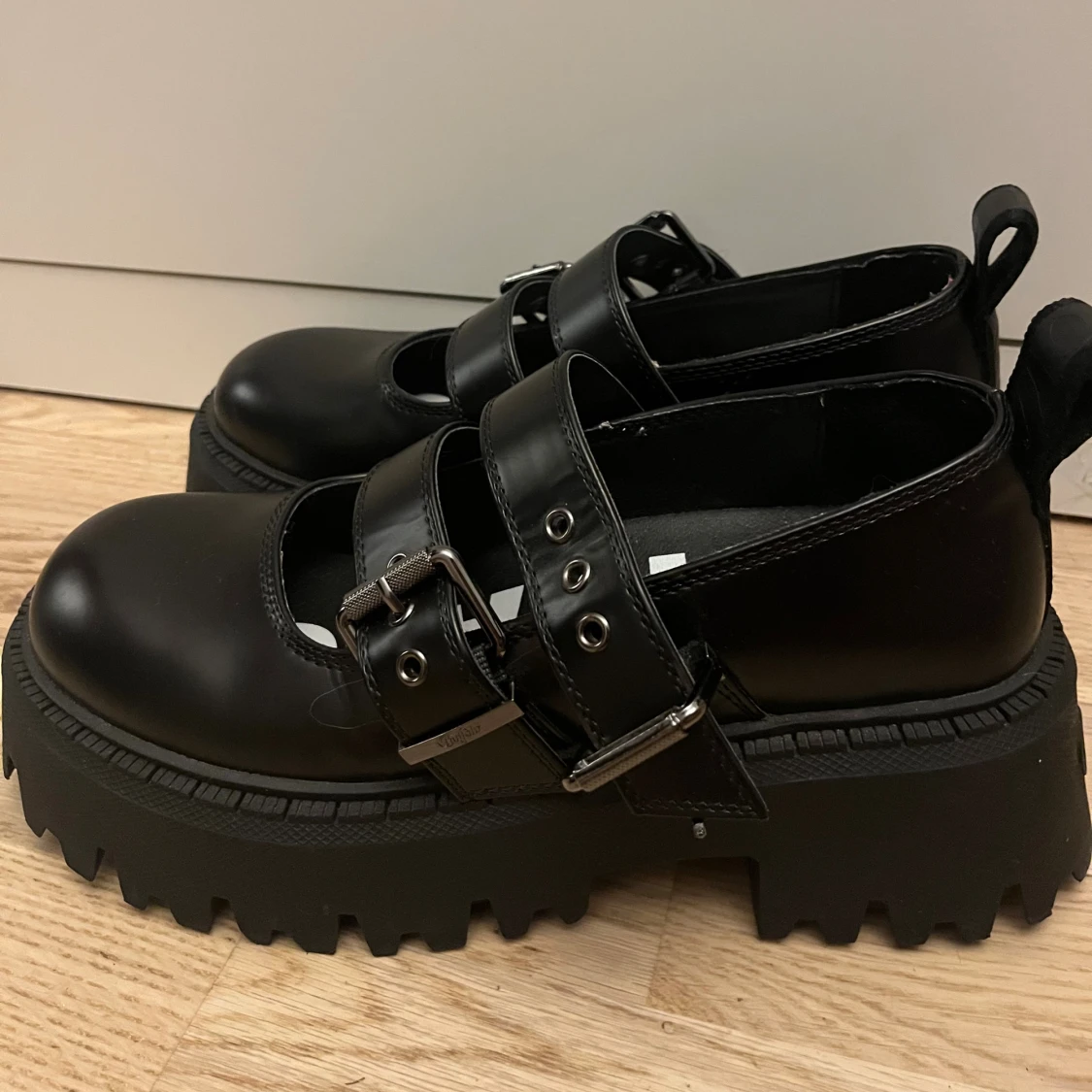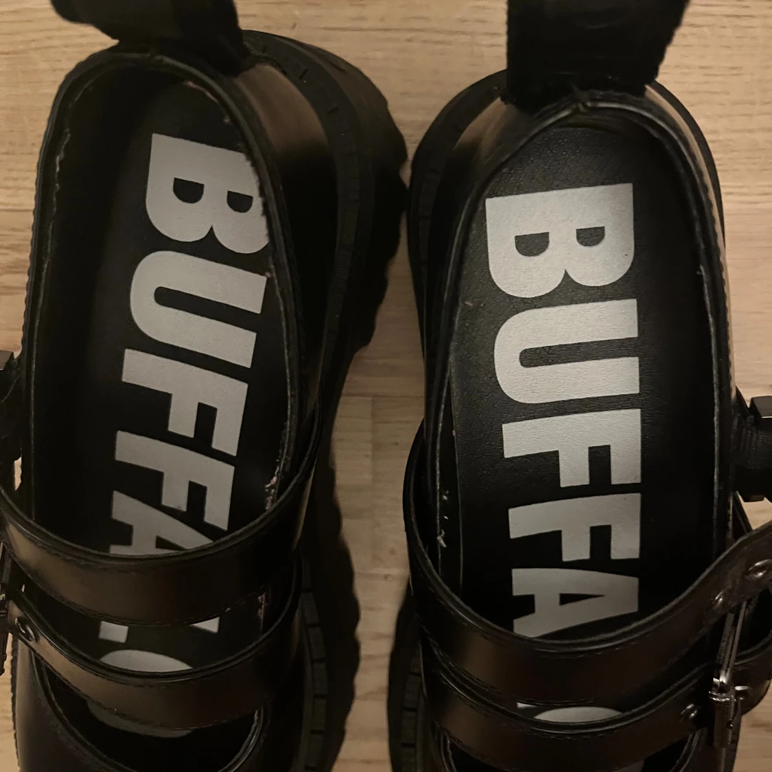 Buffalo ballerinaskor i svart skinn med grov plattformssula och dubbla spännen över foten. Rund tå och robust design som ger en edgy vibe. Perfekt för dig som gillar statement-skor med extra höjd och coola detaljer. Kommer med lådan och använt dom 3 gånger säljer dom för att det är inte min still