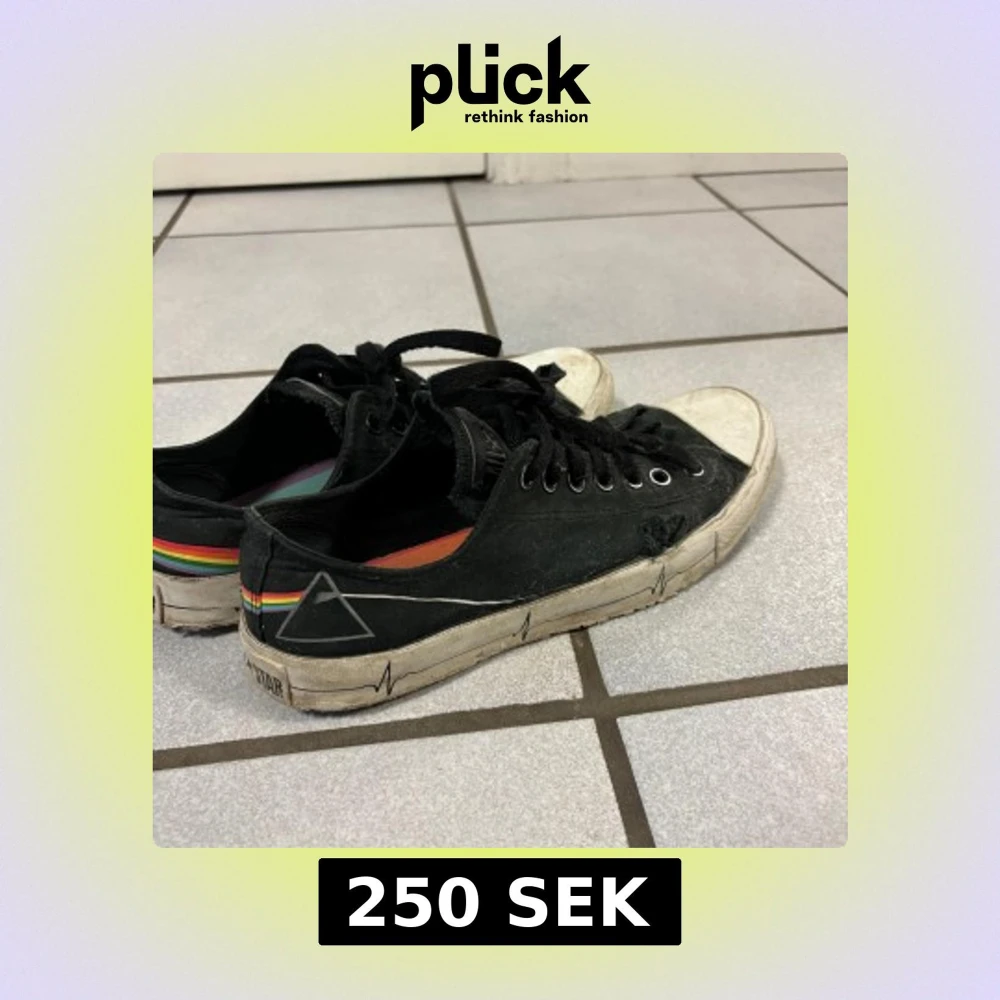 Unika svarta Converse sneakers med regnbågsfärgad rand och triangeldetalj på sidan. Skorna har snörning och en vit sula med svart mönster. Perfekta för en personlig stil. Hål på högra skon