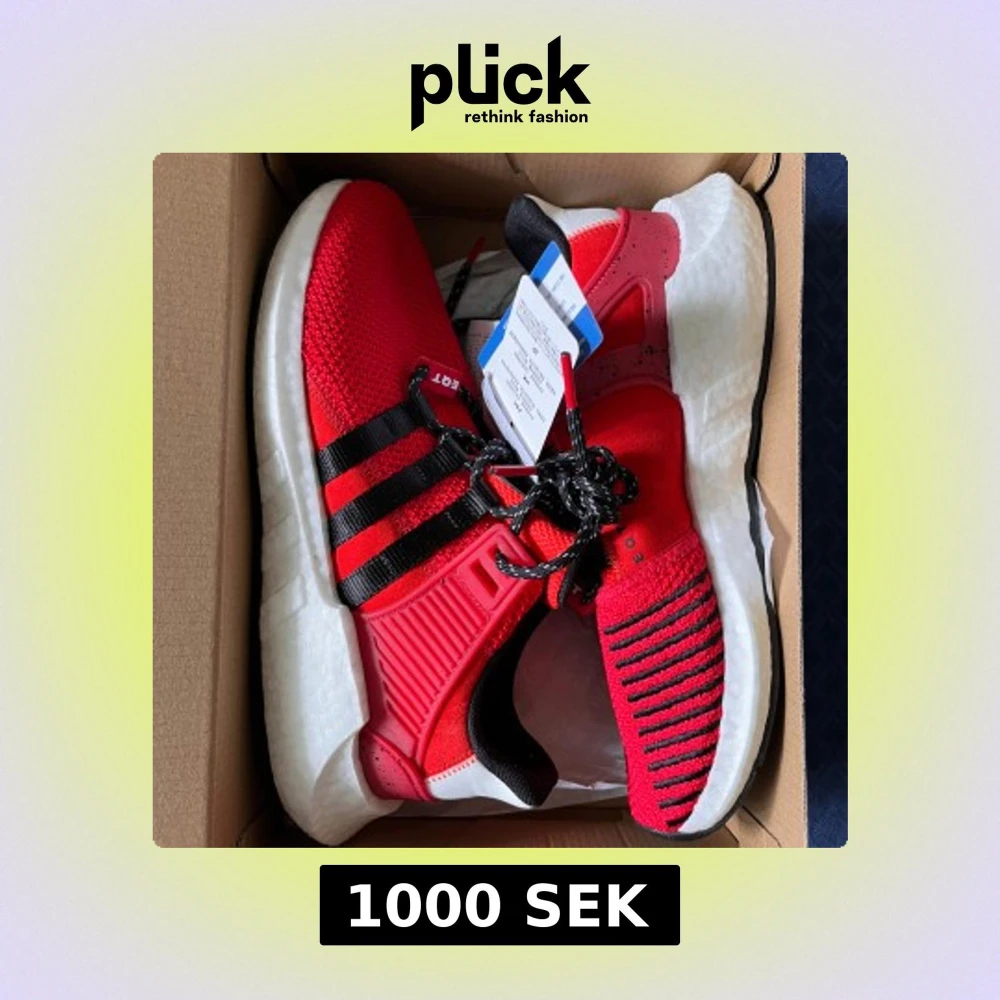 Snygga nya oanvända Adidas EQT Support 93/17 sneakers i rött med svarta detaljer och vita sulor. Skorna har stickad ovandel, svarta ränder på sidorna, svart/vita snören och en chunky vit sula med svart yttersula. Perfekta för dig som gillar sportig och modern stil. EU storlek: 42 2/3