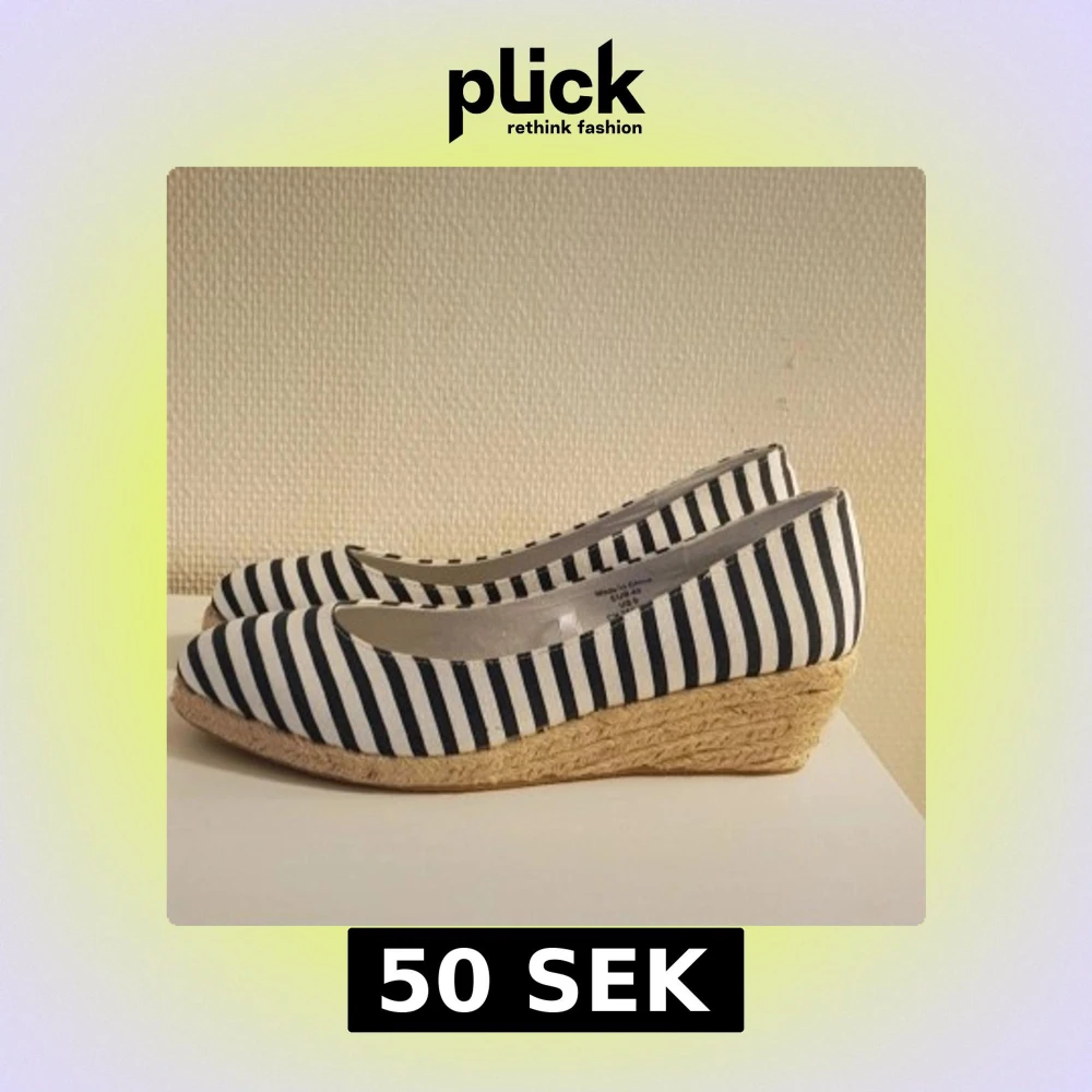 En espadrill skor i vit/marin randig. Storlek 40 från H&M. Normal i storlek. Sparsamt använda. INFO: Hund i hemmet.